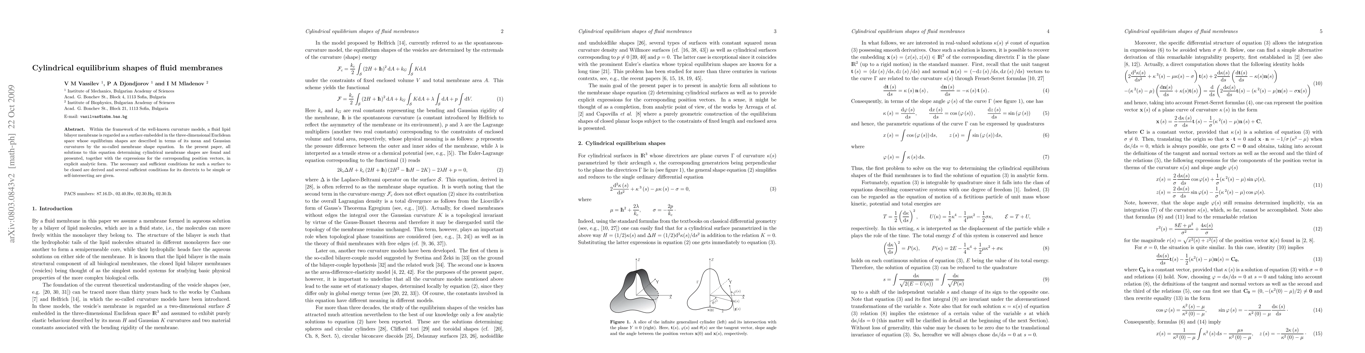 The paper presents explicit analytic solutions for cylindrical equilibrium shapes of fluid membranes, including curvature, slope angles, and integral forms of squared curvatures, along with conditions for closure and simplicity of directrices.