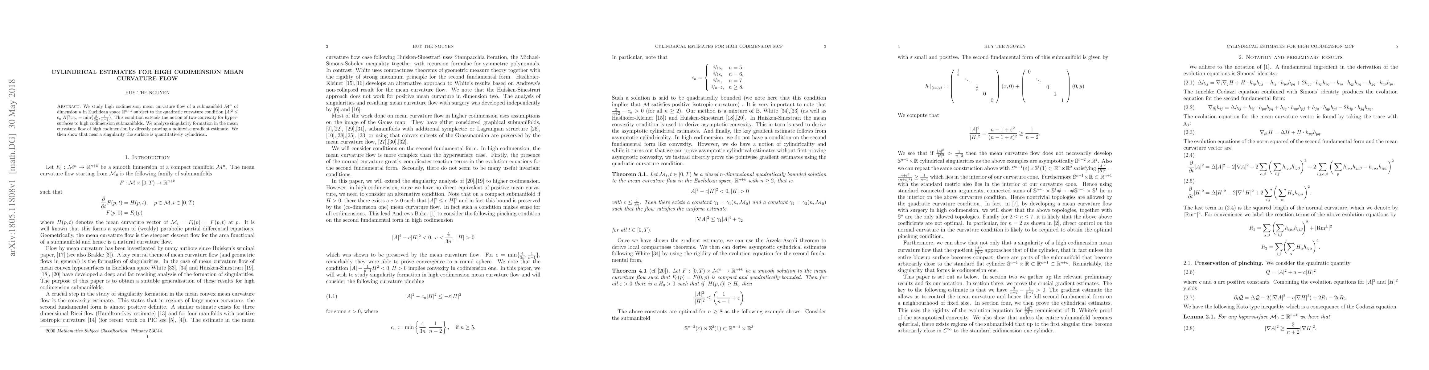 We study high codimension mean curvature flow of a submanifold $\mathcal{M}^n$ of dimension $n$ in Euclidean space $\mathbb{R}^{n+k}$ subject to the quadratic curvature condition $ |A|^{2}\leq c_n |H|^{2}, c _n = \min\{ \frac{4}{3n} , \frac{1}{n-2}\}$. This condition extends the notion of two-convexity for hypersurfaces to high codimension submanifolds. We analyse singularity formation in the mean curvature flow of high codimension by directly proving a pointwise gradient estimate. We then show that near a singularity the surface is quantitatively cylindrical.
