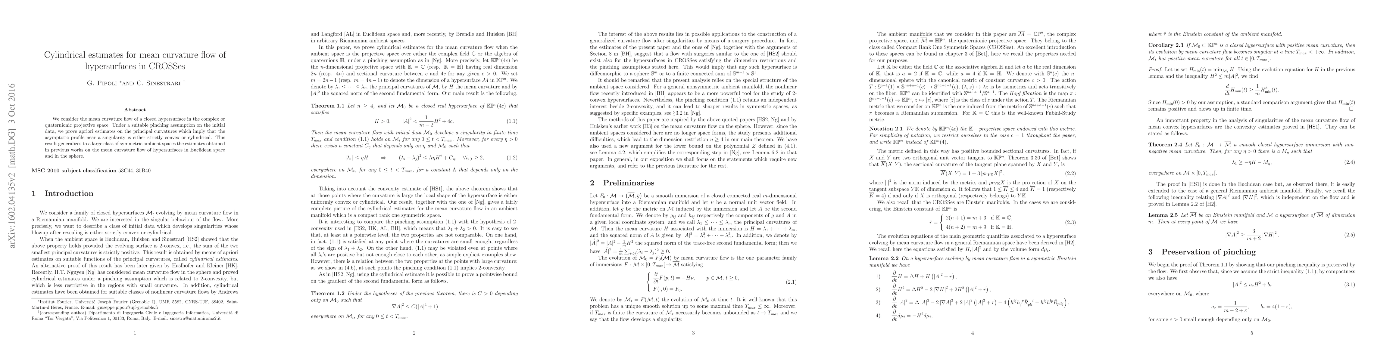 This paper proves apriori estimates for mean curvature flow of closed hypersurfaces in complex or quaternionic projective spaces, showing that singularities exhibit either strictly convex or cylindrical asymptotic profiles under a pinching assumption on initial data. The results generalize previous findings from Euclidean and spherical spaces to a broader class of symmetric ambient spaces.