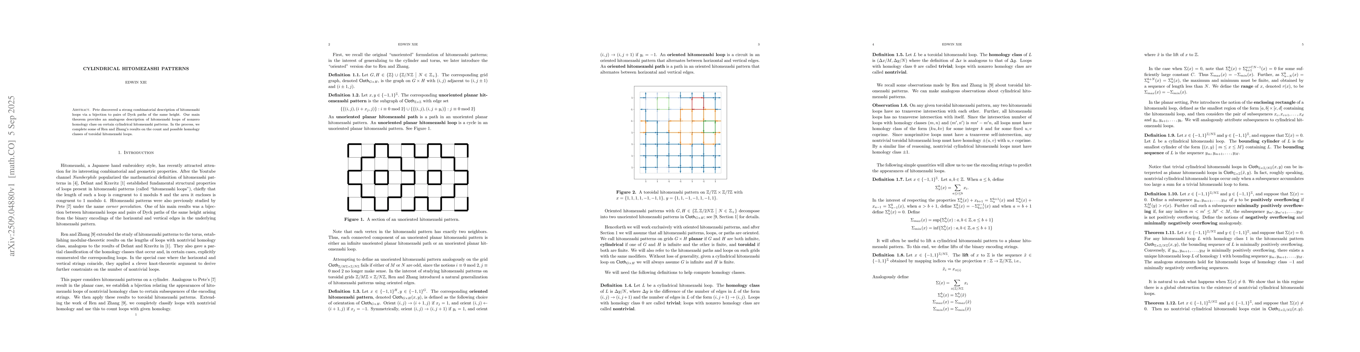 Pete discovered a strong combinatorial description of hitomezashi loops via a bijection to pairs of Dyck paths of the same height. Our main theorem provides an analogous description of hitomezashi loops of nonzero homology class on certain cylindrical hitomezashi patterns. In the process, we complete some of Ren and Zhang's results on the count and possible homology classes of toroidal hitomezashi loops.