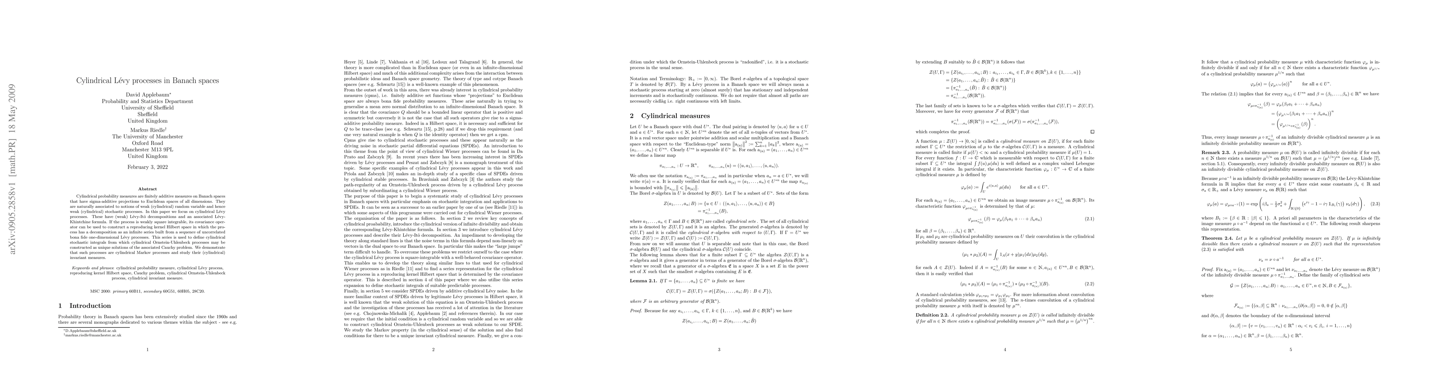 Cylindrical probability measures are finitely additive measures on Banach spaces that have sigma-additive projections to Euclidean spaces of all dimensions. They are naturally associated to notions of weak (cylindrical) random variable and hence weak (cylindrical) stochastic processes. In this paper we focus on cylindrical Levy processes. These have (weak) Levy-Ito decompositions and an associated Levy-Khintchine formula. If the process is weakly square integrable, its covariance operator can be used to construct a reproducing kernel Hilbert space in which the process has a decomposition as an infinite series built from a sequence of uncorrelated bona fide one-dimensional Levy processes. This series is used to define cylindrical stochastic integrals from which cylindrical Ornstein-Uhlenbeck processes may be constructed as unique solutions of the associated Cauchy problem. We demonstrate that such processes are cylindrical Markov processes and study their (cylindrical) invariant measures.