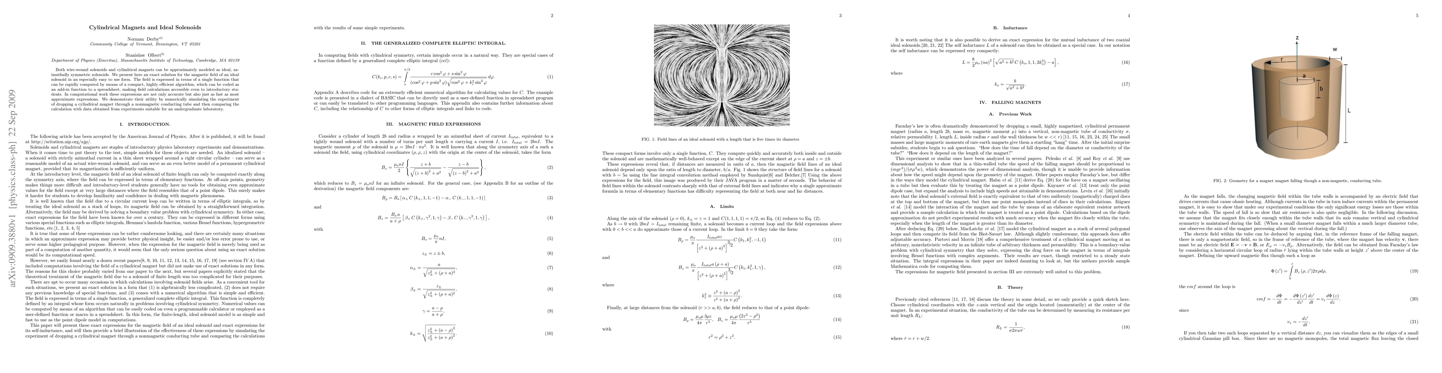 Both wire-wound solenoids and cylindrical magnets can be approximately modeled as ideal, azimuthally symmetric solenoids. We present here an exact solution for the magnetic field of an ideal solenoid in an especially easy to use form. The field is expressed in terms of a single function that can be rapidly computed by means of a compact, highly efficient algorithm, which can be coded as an add-in function to a spreadsheet, making field calculations accessible even to introductory students. In computational work these expressions are not only accurate but also just as fast as most approximate expressions. We demonstrate their utility by numerically simulating the experiment of dropping a cylindrical magnet through a nonmagnetic conducting tube and then comparing the calculation with data obtained from experiments suitable for an undergraduate laboratory.