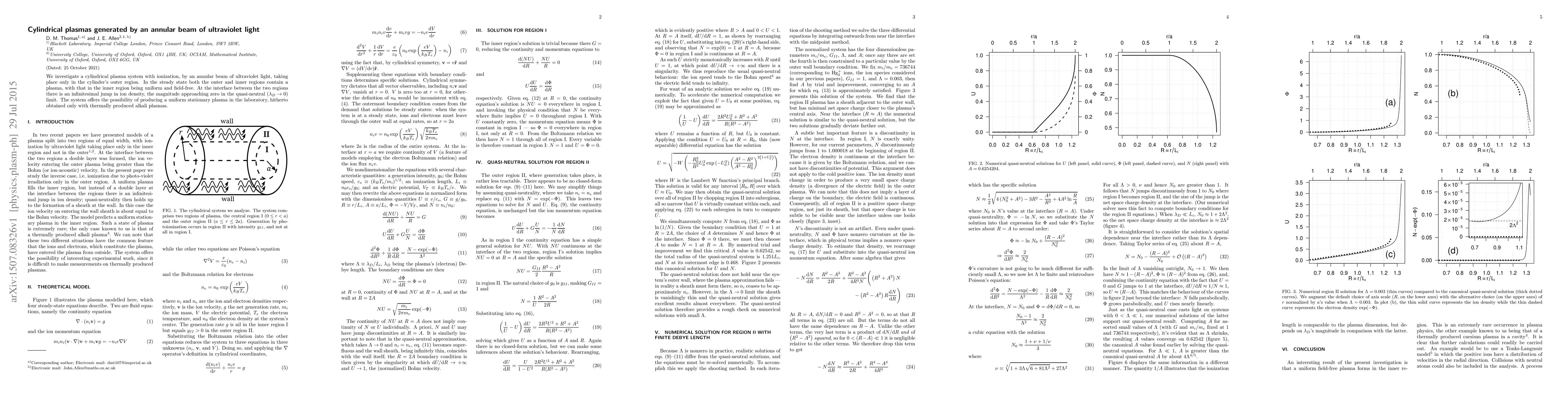 This paper explores cylindrical plasmas generated by an annular ultraviolet light beam, focusing on the ionization occurring in the outer region. It reveals a uniform, field-free plasma in the inner region, with a minimal ion density jump at the interface, suggesting a method for creating a stable laboratory plasma.
