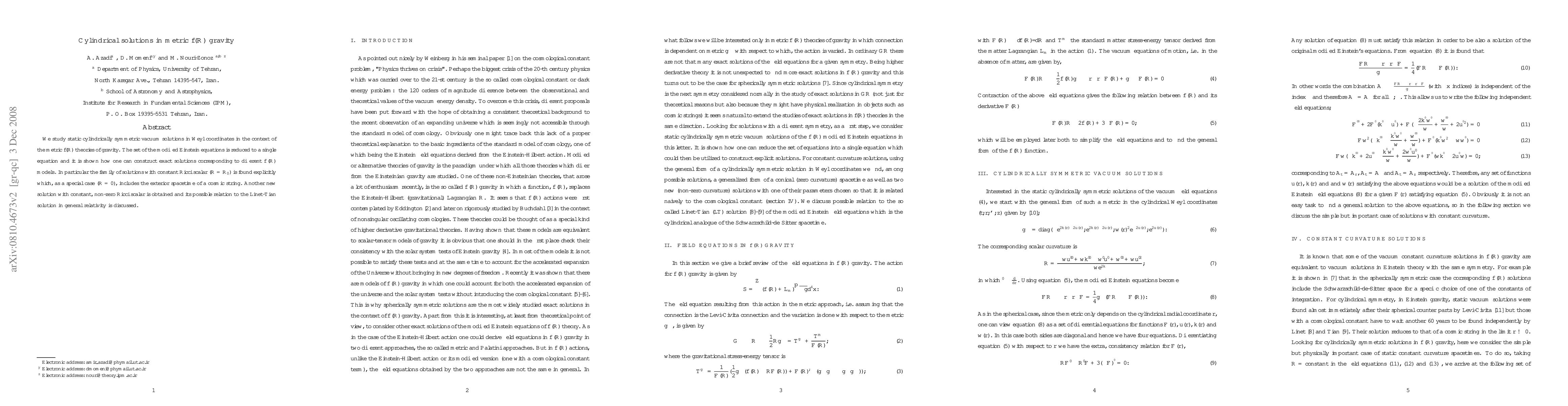 We study static cylindrically symmetric vacuum solutions in Weyl coordinates in the context of the metric f(R) theories of gravity. The set of the modified Einstein equations is reduced to a single equation and it is shown how one can construct exact solutions corresponding to different $f(R)$ models. In particular the family of solutions with constant Ricci scalar ($R=R_{0}$) is found explicitly which, as a special case (R=0), includes the exterior spacetime of a cosmic string. Another new solution with constant, non-zero Ricci scalar is obtained and its possible relation to the Linet-Tian solution in general relativity is discussed.