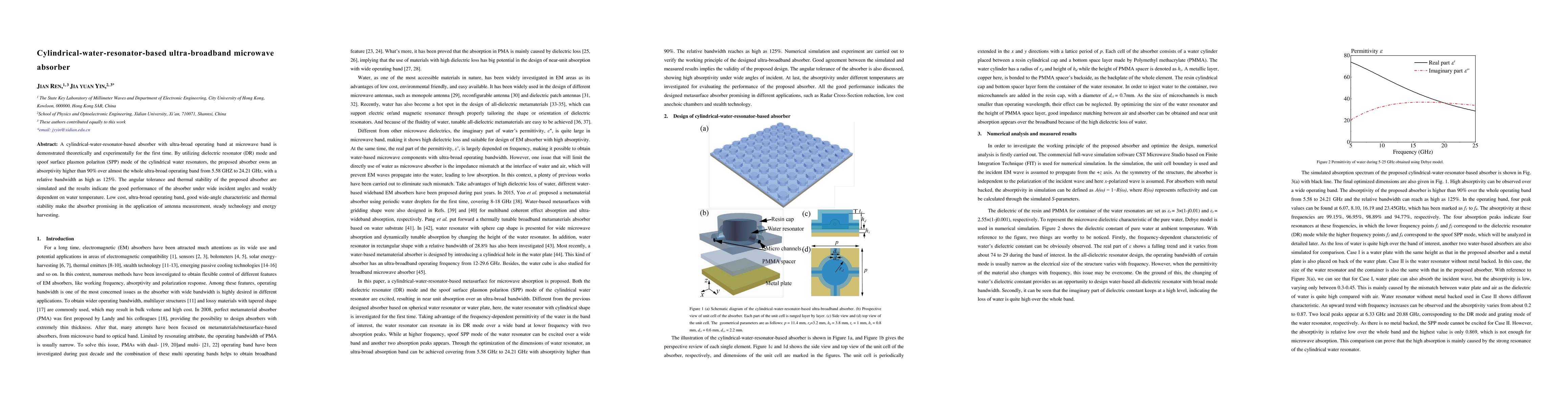 A cylindrical-water-resonator-based absorber with ultra-broad operating band at microwave band is demonstrated theoretically and experimentally for the first time. By utilizing dielectric resonator (DR) mode and spoof surface plasmon polariton (SPP) mode of the cylindrical water resonators, the proposed absorber owns an absorptivity higher than 90% over almost the whole ultra-broad operating band from 5.58 GHz to 24.21 GHz, with a relative bandwidth as high as 125%. The angular tolerance and thermal stability of the proposed absorber are simulated and the results indicate the good performance of the absorber under wide incident angles and weakly dependent on water temperature. Low cost, ultra-broad operating band, good wide-angle characteristic and thermal stability make the absorber promising in the application of antenna measurement, steady technology and energy harvesting.