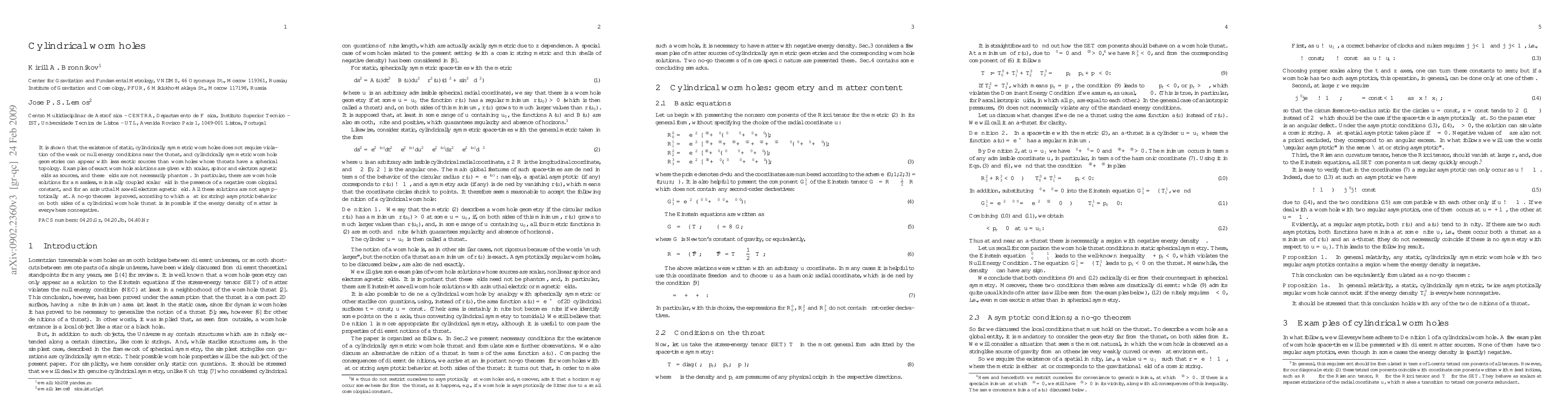 This paper demonstrates that cylindrical wormholes can exist without violating the weak or null energy conditions, using less exotic sources than those needed for spherical wormholes. It presents exact solutions with scalar, spinor, and electromagnetic fields, including a massless scalar field with a negative cosmological constant and an azimuthal electromagnetic field, all showing non-asymptotically flat geometries. A no-go theorem is also established, proving that flat asymptotic behavior is impossible for cylindrical wormholes with nonnegative energy density.