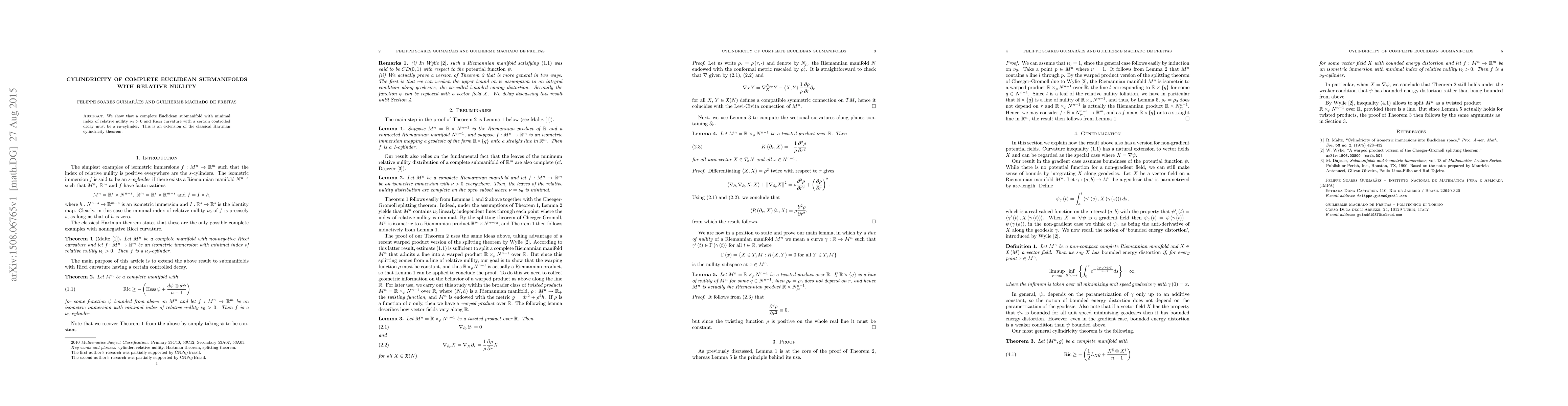 This paper proves that complete Euclidean submanifolds with minimal relative nullity index $\nu_0>0$ and Ricci curvature exhibiting controlled decay are $\nu_0$-cylinders, extending the classical Hartman cylindricity theorem.