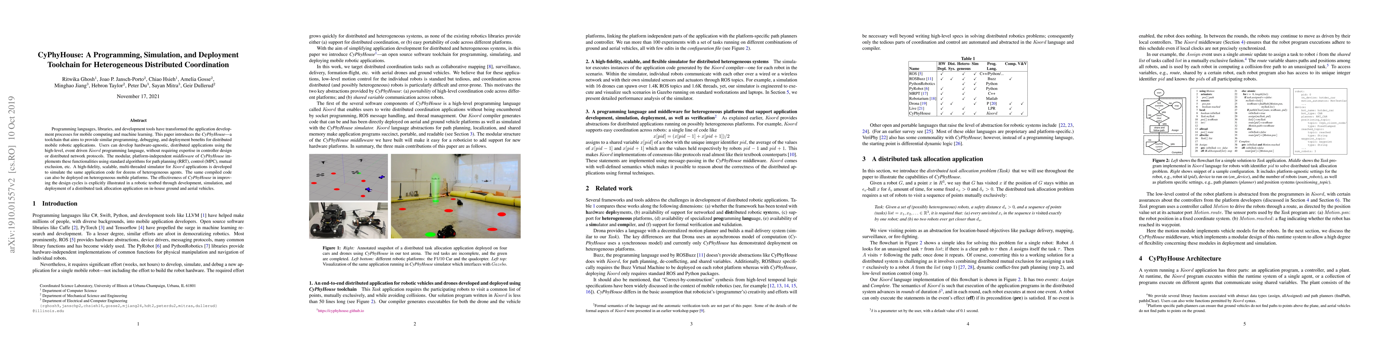 CyPhyHouse is a toolchain for developing, simulating, and deploying distributed mobile robotic applications using a high-level, event-driven language (Koord). It offers hardware-agnostic, platform-independent solutions, simplifying complex tasks like path planning and mutual exclusion, and demonstrating improved design cycles through a real-world robotic testbed.