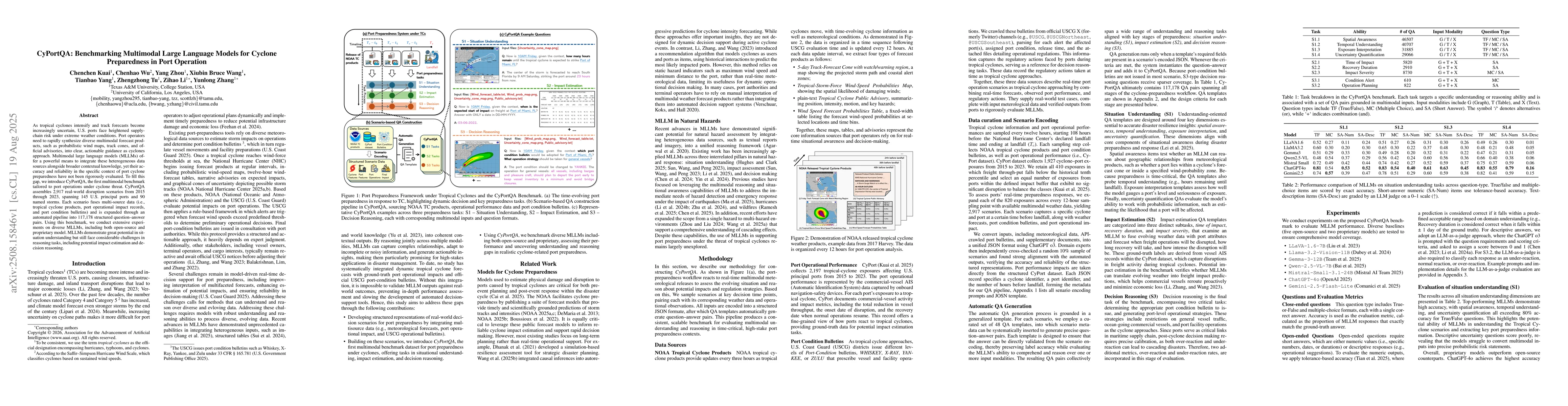 As tropical cyclones intensify and track forecasts become increasingly uncertain, U.S. ports face heightened supply-chain risk under extreme weather conditions. Port operators need to rapidly synthesize diverse multimodal forecast products, such as probabilistic wind maps, track cones, and official advisories, into clear, actionable guidance as cyclones approach. Multimodal large language models (MLLMs) offer a powerful means to integrate these heterogeneous data sources alongside broader contextual knowledge, yet their accuracy and reliability in the specific context of port cyclone preparedness have not been rigorously evaluated. To fill this gap, we introduce CyPortQA, the first multimodal benchmark tailored to port operations under cyclone threat. CyPortQA assembles 2,917 realworld disruption scenarios from 2015 through 2023, spanning 145 U.S. principal ports and 90 named storms. Each scenario fuses multisource data (i.e., tropical cyclone products, port operational impact records, and port condition bulletins) and is expanded through an automated pipeline into 117,178 structured question answer pairs. Using this benchmark, we conduct extensive experiments on diverse MLLMs, including both open-source and proprietary model. MLLMs demonstrate great potential in situation understanding but still face considerable challenges in reasoning tasks, including potential impact estimation and decision reasoning.