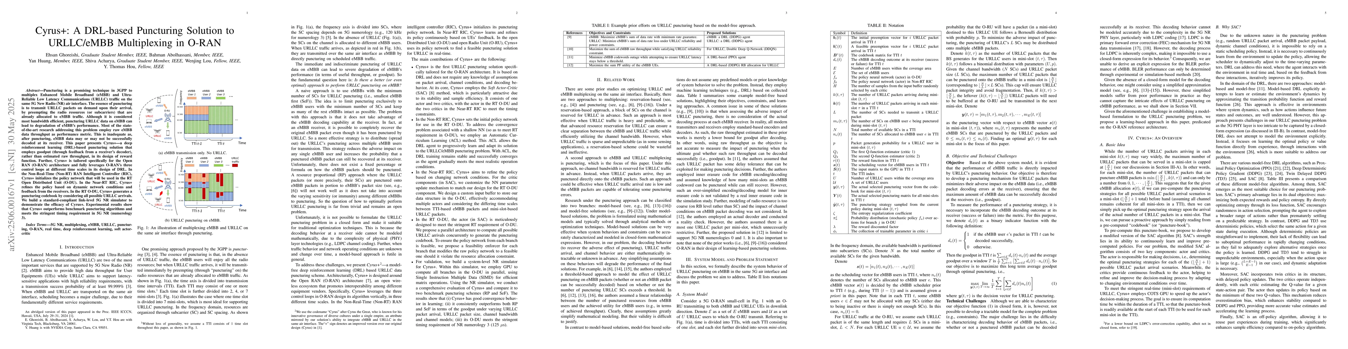 Cyrus+ is a deep reinforcement learning-based puncturing solution for 5G NR that prioritizes goodput over raw throughput, outperforming benchmark algorithms in eMBB/URLLC multiplexing while meeting stringent timing requirements.