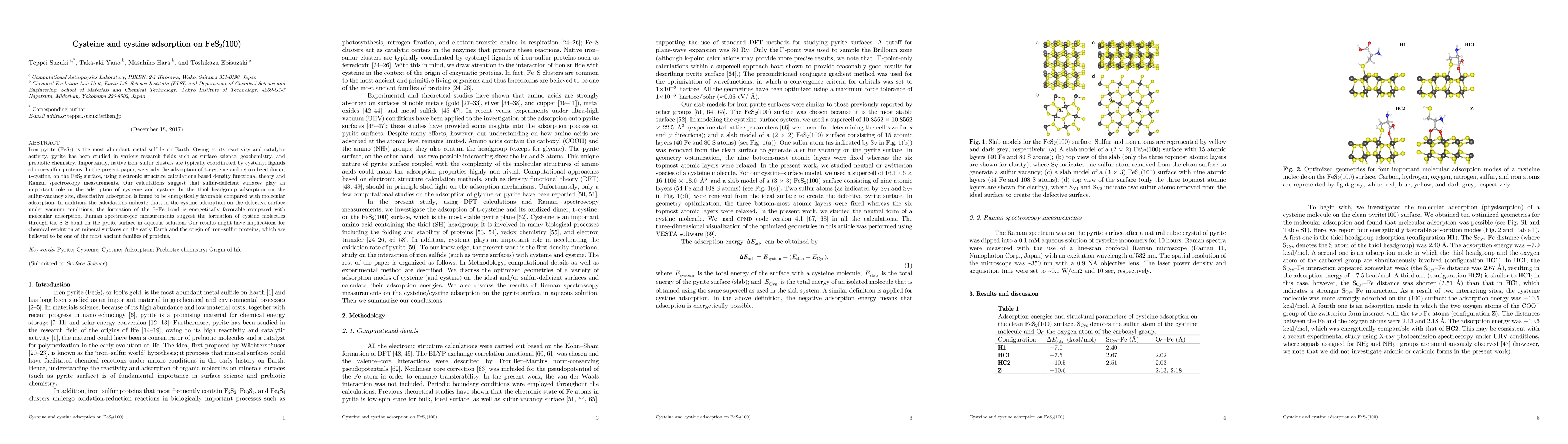 This paper investigates the adsorption of L-cysteine and L-cystine on FeS$_{2}$ using DFT calculations and Raman spectroscopy, revealing that sulfur-deficient surfaces facilitate dissociative adsorption. The study suggests implications for chemical evolution and the origin of iron-sulfur proteins.