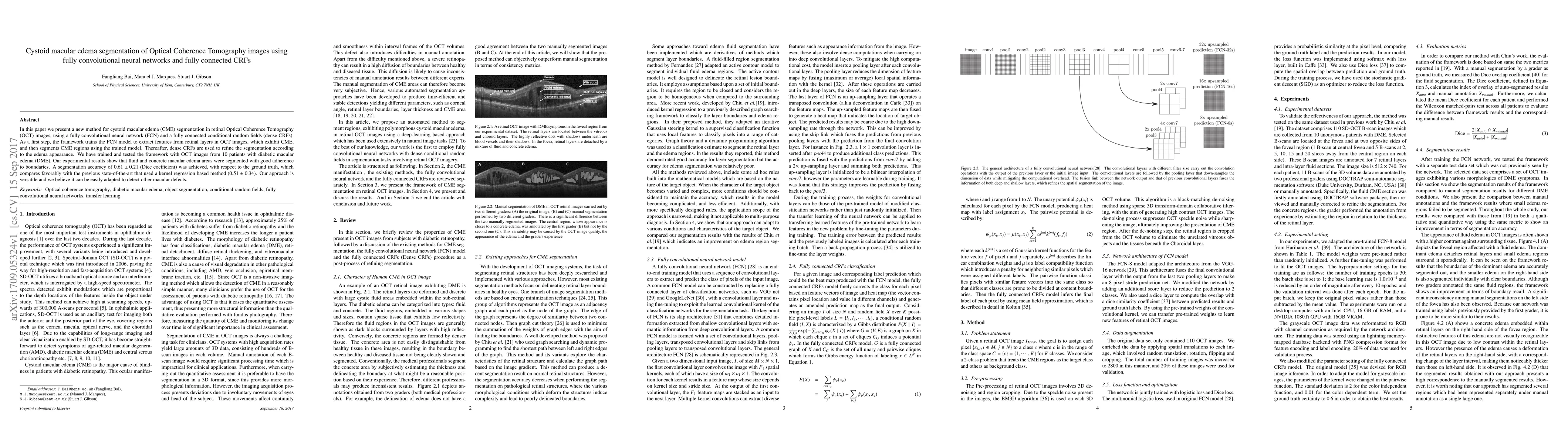 This paper introduces a method for segmenting cystoid macular edema in OCT images using a fully convolutional neural network and fully connected CRFs for refinement. The proposed framework achieved a segmentation accuracy of 0.61±0.21 (Dice coefficient), outperforming previous methods and showing potential for detecting other macular defects.