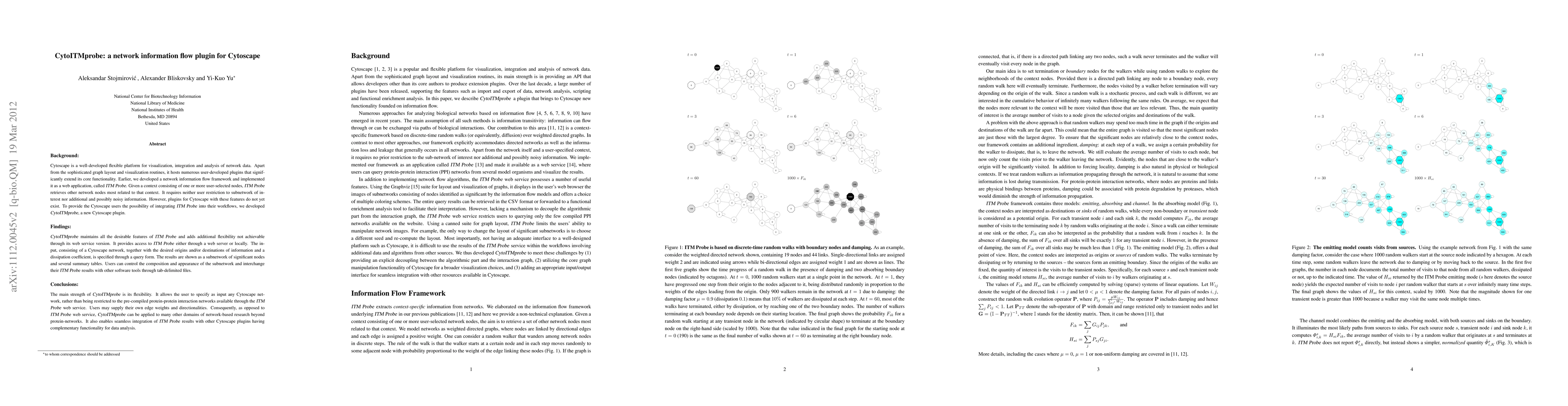 To provide the Cytoscape users the possibility of integrating ITM Probe into their workflows, we developed CytoITMprobe, a new Cytoscape plugin. CytoITMprobe maintains all the desirable features of ITM Probe and adds additional flexibility not achievable through its web service version. It provides access to ITM Probe either through a web server or locally. The input, consisting of a Cytoscape network, together with the desired origins and/or destinations of information and a dissipation coefficient, is specified through a query form. The results are shown as a subnetwork of significant nodes and several summary tables. Users can control the composition and appearance of the subnetwork and interchange their ITM Probe results with other software tools through tab-delimited files. The main strength of CytoITMprobe is its flexibility. It allows the user to specify as input any Cytoscape network, rather than being restricted to the pre-compiled protein-protein interaction networks available through the ITM Probe web service. Users may supply their own edge weights and directionalities. Consequently, as opposed to ITM Probe web service, CytoITMprobe can be applied to many other domains of network-based research beyond protein-networks. It also enables seamless integration of ITM Probe results with other Cytoscape plugins having complementary functionality for data analysis.