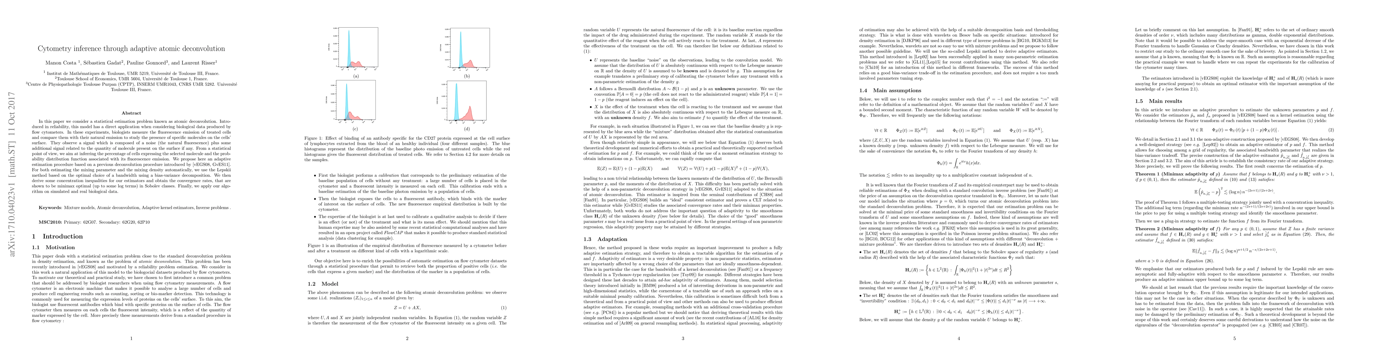 In this paper we consider a statistical estimation problem known as atomic deconvolution. Introduced in reliability, this model has a direct application when considering biological data produced by flow cytometers. In these experiments, biologists measure the fluorescence emission of treated cells and compare them with their natural emission to study the presence of specific molecules on the cells' surface. They observe a signal which is composed of a noise (the natural fluorescence) plus some additional signal related to the quantity of molecule present on the surface if any. From a statistical point of view, we aim at inferring the percentage of cells expressing the selected molecule and the probability distribution function associated with its fluorescence emission. We propose here an adap-tive estimation procedure based on a previous deconvolution procedure introduced by [vEGS08, GvES11]. For both estimating the mixing parameter and the mixing density automatically, we use the Lepskii method based on the optimal choice of a bandwidth using a bias-variance decomposition. We then derive some concentration inequalities for our estimators and obtain the convergence rates, that are shown to be minimax optimal (up to some log terms) in Sobolev classes. Finally, we apply our algorithm on simulated and real biological data.
