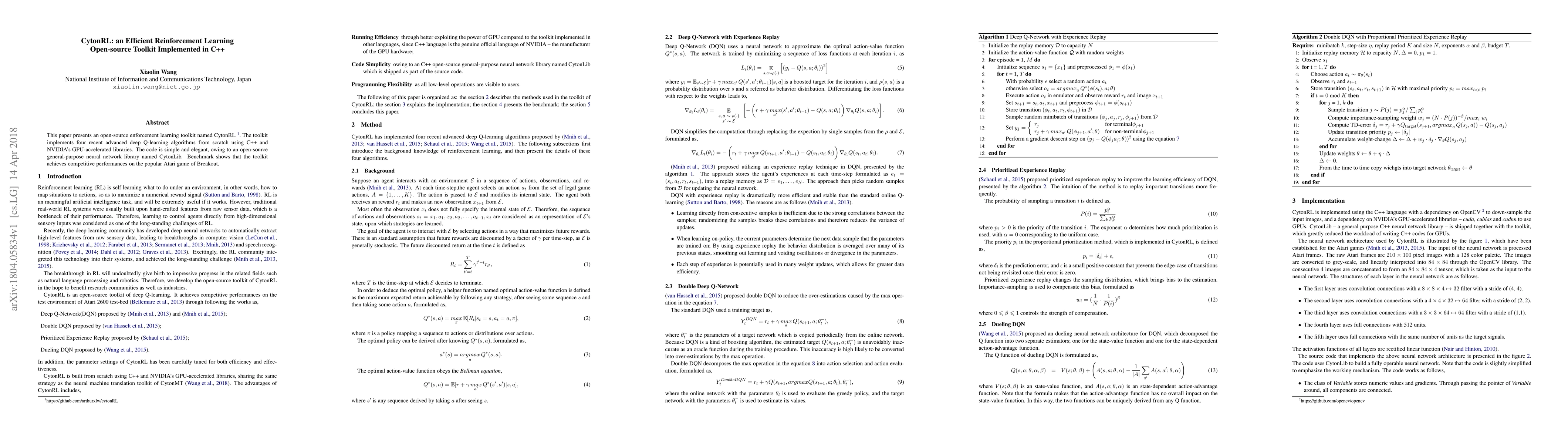 This paper introduces CytonRL, an open-source toolkit for reinforcement learning implemented in C++ with GPU acceleration, featuring four advanced deep Q-learning algorithms. Benchmark results demonstrate competitive performance on the Atari game Breakout.