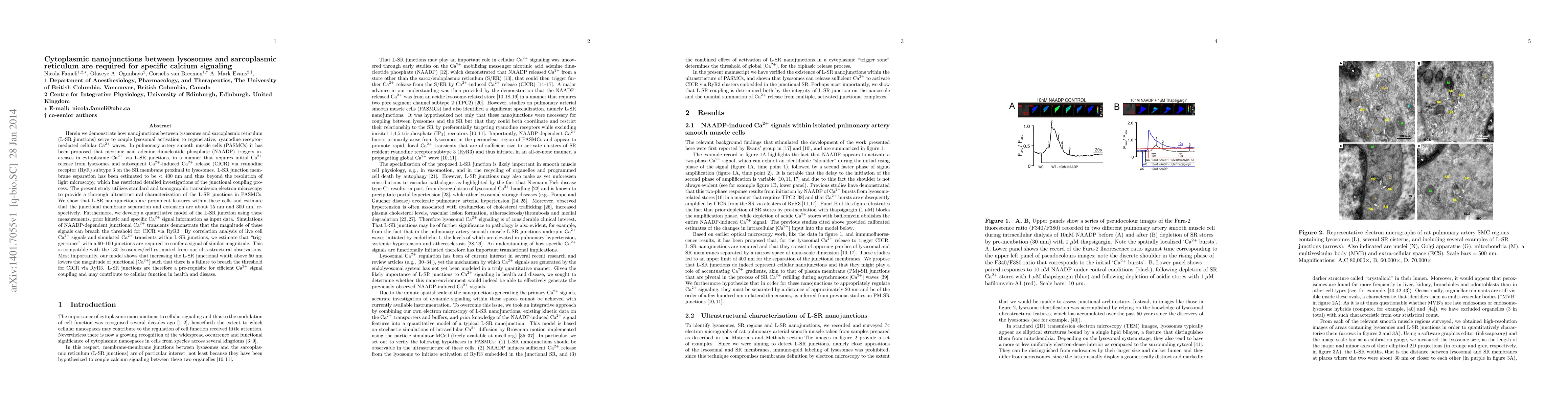 We demonstrate how nanojunctions between lysosomes and sarcoplasmic reticulum (L-SR junctions) serve to couple lysosomal activation to regenerative, ryanodine receptor-mediated cellular calcium (Ca2+) waves. In pulmonary artery smooth muscle cells (PASMCs) nicotinic acid adenine dinucleotide phosphate (NAADP) may trigger increases in cytoplasmic Ca2+ via L-SR junctions, in a manner that requires initial Ca2+ release from lysosomes and subsequent Ca2+-induced Ca2+ release (CICR) via ryanodine receptor (RyR) subtype 3 on the SR membrane proximal to lysosomes. L-SR junction membrane separation has been estimated to be <400 nm and thus beyond the resolution of light microscopy. This study utilizes transmission electron microscopy to provide a thorough ultrastructural characterization of the L-SR junctions in PASMCs. These junctions are prominent features in these cells and we estimate that the membrane separation and extension are about 15 nm and 300 nm, respectively. We also develop a quantitative model of the L-SR junction using these measurements, prior kinetic and specific Ca2+ signal information as input data. Simulations of NAADP-dependent junctional Ca2+ transients show that the magnitude of these signals can breach the threshold for CICR via RyR3. By correlation analysis of live cell Ca2+ signals and simulated L-SR junctional Ca2+ transients, we estimate that "trigger zones" with a 60-100 junctions are required to confer a signal of similar magnitude. This is compatible with the 130 lysosomes/cell estimated from our ultrastructural observations. Most importantly, our model shows that increasing the L-SR junctional width above 50 nm lowers the magnitude of junctional [Ca2+] such that there is a failure to breach the threshold for CICR via RyR3. L-SR junctions are therefore a pre-requisite for efficient Ca2+ signal coupling and may contribute to cellular function in health and disease.