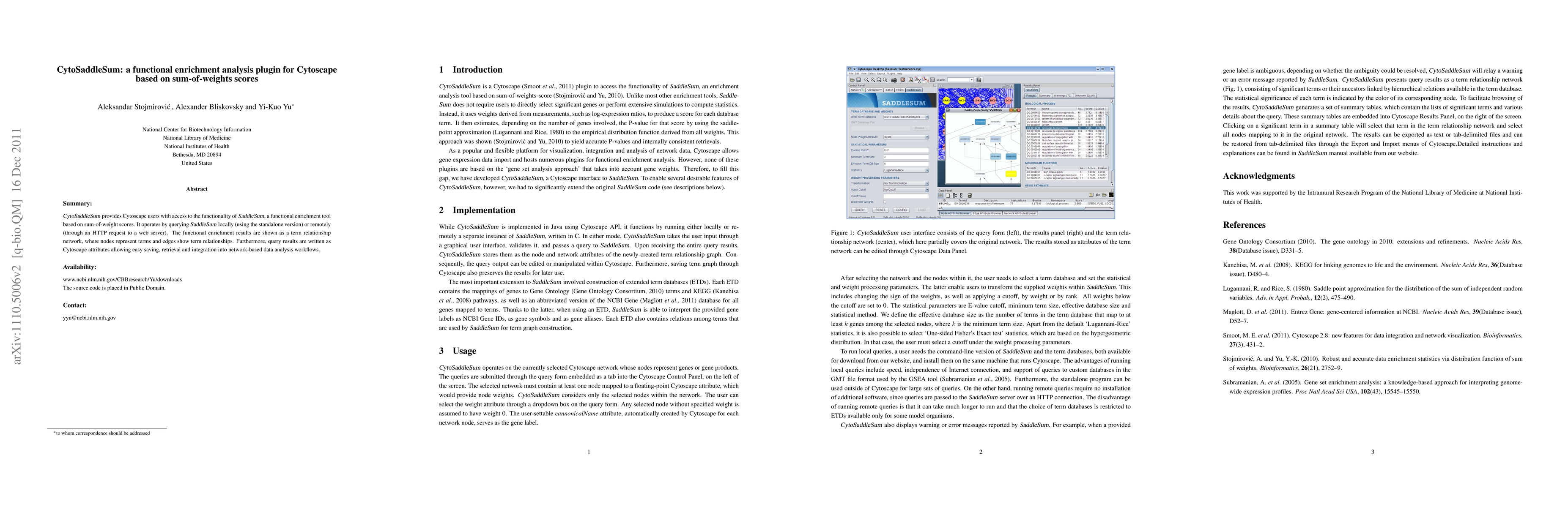 CytoSaddleSum is a Cytoscape plugin that integrates functional enrichment analysis using SaddleSum's sum-of-weight scores, providing users with visual term relationship networks and easy data integration.