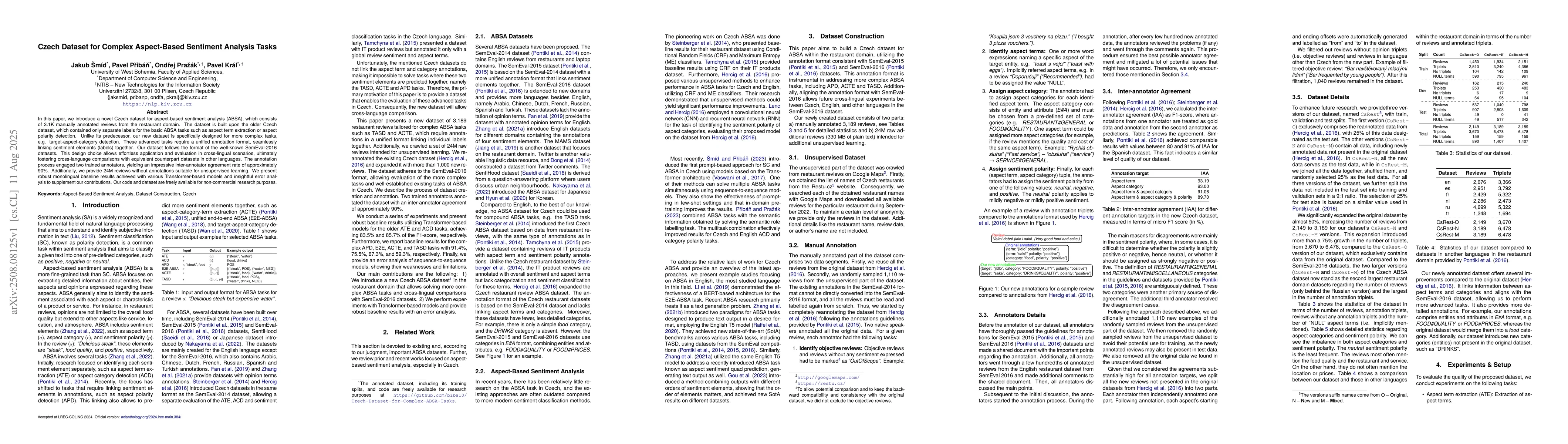 The paper introduces a novel Czech dataset for aspect-based sentiment analysis (ABSA) in the restaurant domain, manually annotated with 3.1K reviews. The dataset is designed for complex tasks like target-aspect-category detection and follows the format of SemEval-2016 datasets, allowing cross-lingual comparisons.