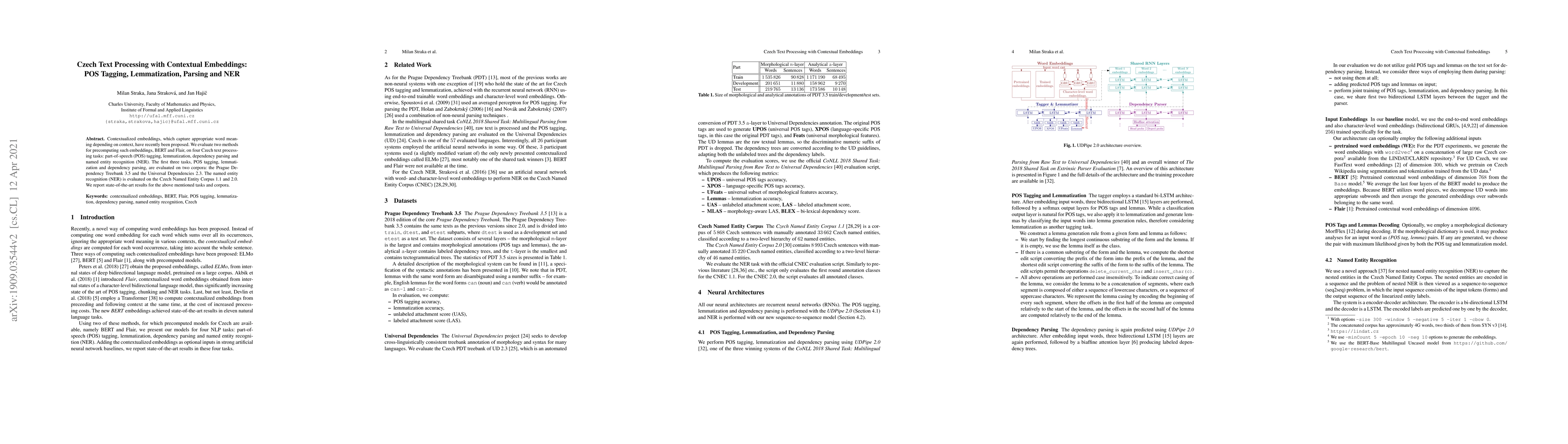 This paper evaluates BERT and Flair contextual embeddings on four Czech text processing tasks: POS tagging, lemmatization, dependency parsing, and NER, achieving state-of-the-art results across multiple corpora. The study highlights the effectiveness of contextual embeddings in improving performance on these linguistic tasks.