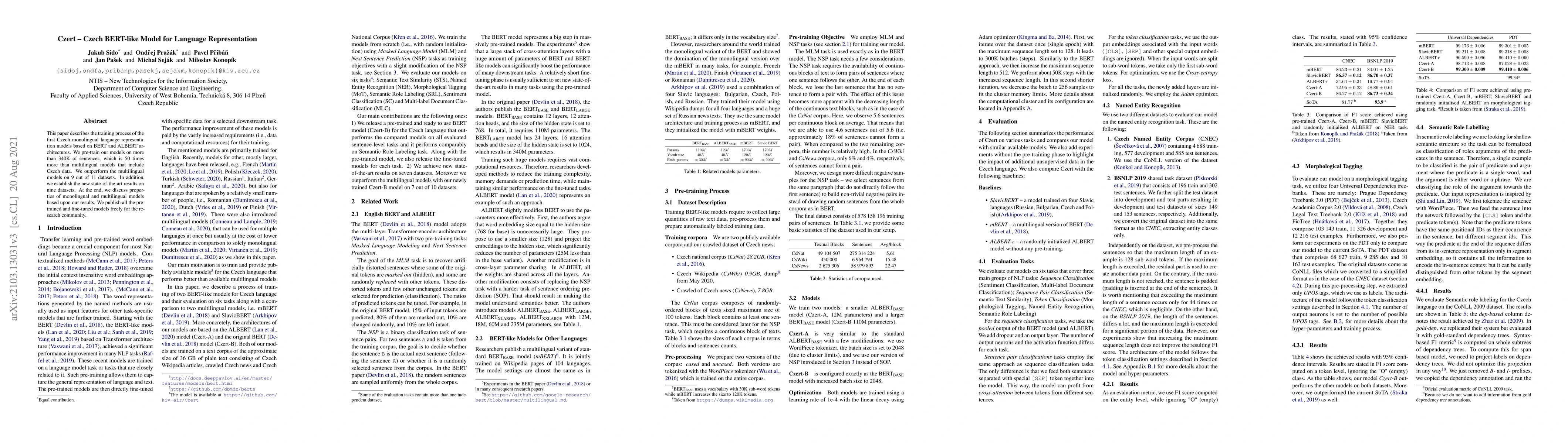 This paper introduces Czert, a Czech BERT-like model pre-trained on 50 times more data than multilingual models, achieving state-of-the-art results on nine datasets and outperforming multilingual models on nine out of eleven datasets. The authors release all models for public use.