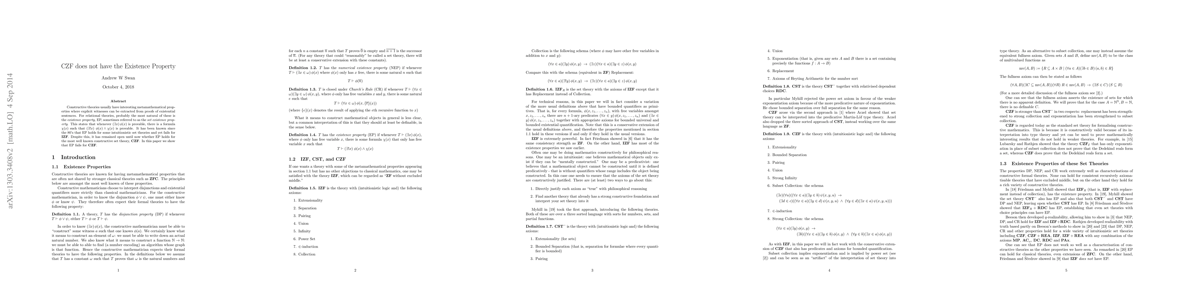 Researchers found that Constructive Zermelo-Fraenkel set theory (CZF) does not have the existence property, a key metamathematical property of constructive theories. This challenges long-held assumptions about CZF's properties and opens up new avenues for exploration in mathematical logic.