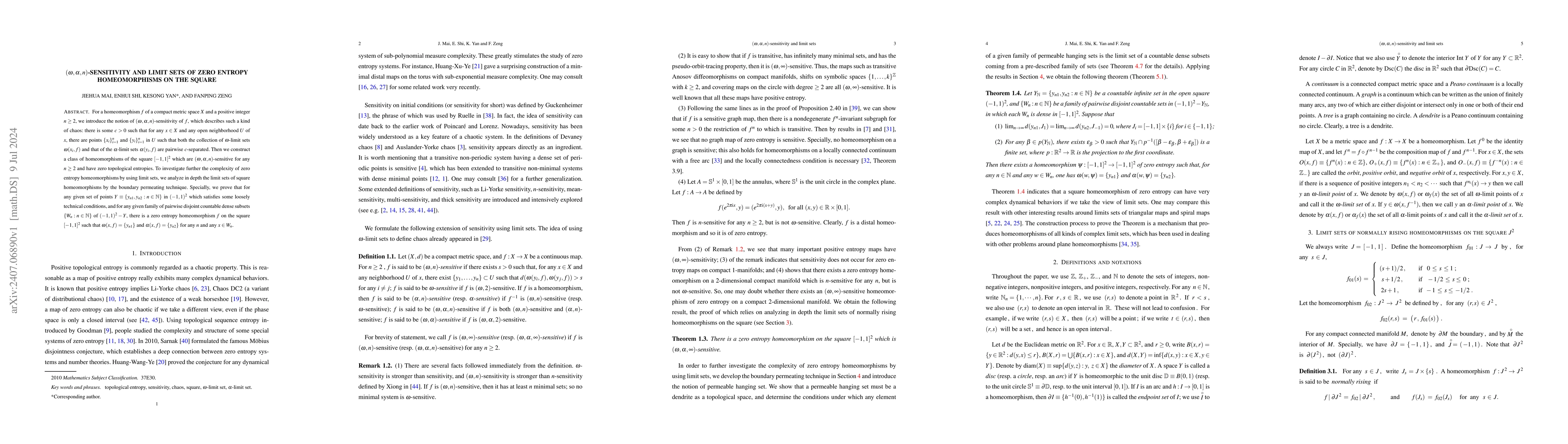 This paper introduces $(\omega, \alpha, n)$-sensitivity, a new chaos measure for homeomorphisms, and constructs zero entropy homeomorphisms of the square that exhibit this sensitivity. It also uses boundary permeating techniques to analyze the limit sets of such homeomorphisms.