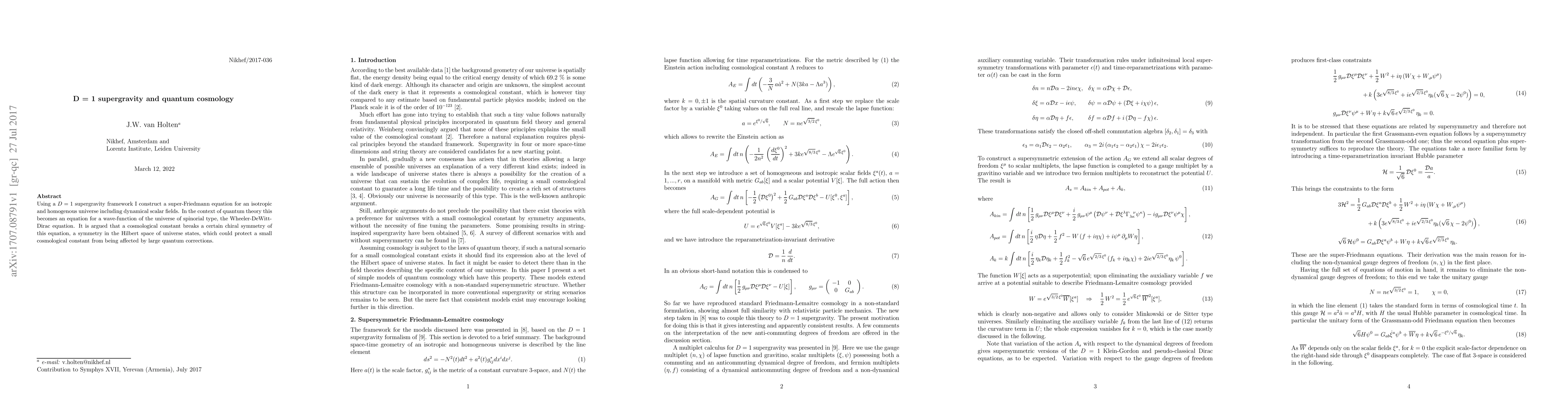 This paper constructs a super-Friedmann equation in a D = 1 supergravity framework for an isotropic and homogeneous universe, incorporating dynamical scalar fields. It proposes that this leads to a Wheeler-DeWitt-Dirac equation for the wave-function of the universe, suggesting that a cosmological constant may protect it from quantum corrections by breaking a chiral symmetry.