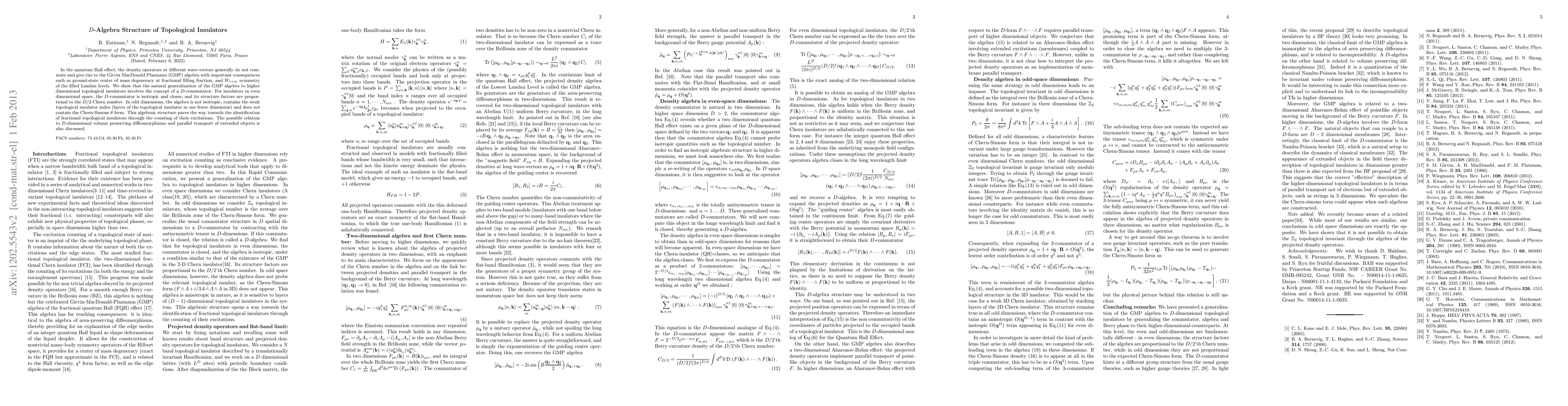 In the quantum Hall effect, the density operators at different wave-vectors generally do not commute and give rise to the Girvin MacDonald Plazmann (GMP) algebra with important consequences such as ground-state center of mass degeneracy at fractional filling fraction, and W_{1 + \infty} symmetry of the filled Landau levels. We show that the natural generalization of the GMP algebra to higher dimensional topological insulators involves the concept of a D-algebra formed by using the fully anti-symmetric tensor in D-dimensions. For insulators in even dimensional space, the D-algebra is isotropic and closes for the case of constant non-Abelian F(k) ^ F(k) ... ^ F(k) connection (D-Berry curvature), and its structure factors are proportional to the D/2-Chern number. In odd dimensions, the algebra is not isotropic, contains the weak topological insulator index (layers of the topological insulator in one less dimension) and does not contain the Chern-Simons \theta form (F ^ A - 2/3 A ^ A ^ A in 3 dimensions). The Chern-Simons form appears in a certain combination of the parallel transport and simple translation operator which is not an algebra. The possible relation to D-dimensional volume preserving diffeomorphisms and parallel transport of extended objects is also discussed.
