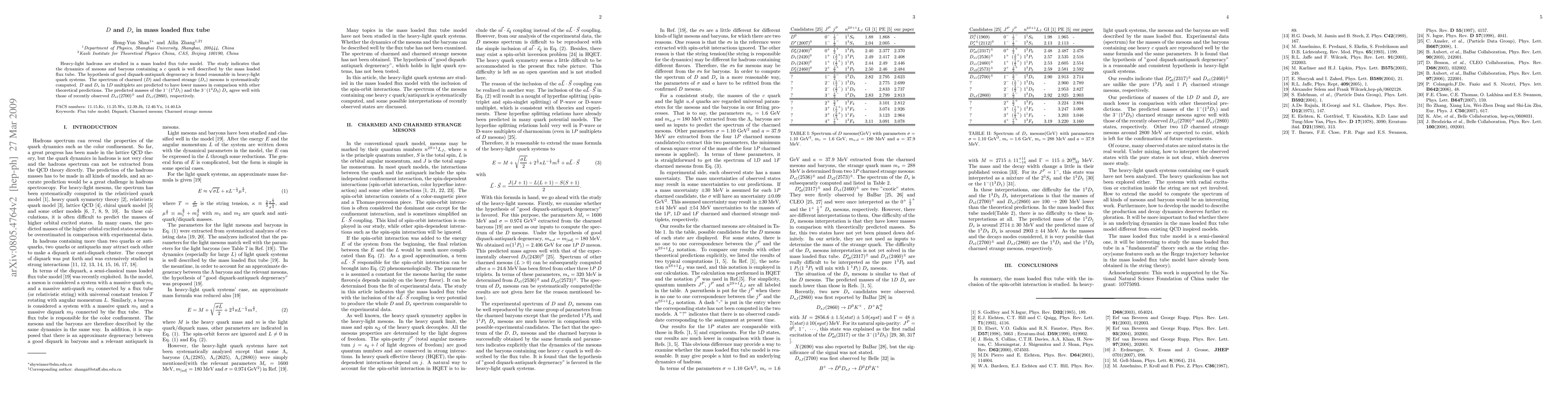 This study explores heavy-light hadrons within a mass loaded flux tube model, finding that it accurately describes the dynamics of $c$ quark-containing mesons and baryons. The research predicts lower masses for $D$ and $D_s$ mesons in 1D multiplets compared to other theories, with good agreement between predicted and observed masses for $D_{s1}(2700)^{\pm}$ and $D_{sJ}(2860)$.