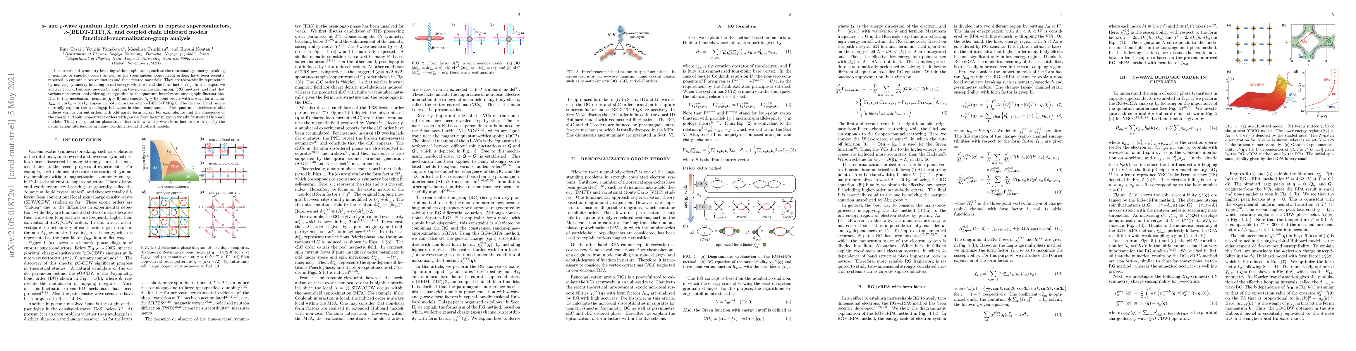 Unconventional symmetry breaking without spin order,such as the rotational symmetry breaking (=nematic or smectic) orders as well as the spontaneous loop-current orders, have been recently reported in cuprate superconductors and their related materials.They are theoretically represented by non-$A_{1g}$ symmetry breaking in self-energy, which we call the form factor $f_{k,q}$.In this paper, we analyze typical Hubbard models by applying the renormalization-group (RG) method, and find that various unconventional ordering emerges due to the quantum interference among spin fluctuations. Due to this mechanism,nematic ($q=0$) and smectic ($q \ne 0$)bond orders with $d$-wave form factor appear $f_{k,q}\propto \cos k_x - \cos k_y$ in both cuprates and $\kappa$-(BEDT-TTF)$_2$X. The derived bond orders naturally explain the pseudogap behaviors in these compounds. The quantum interference also induces various current orders with odd-parity form factor. For example, we find the emergence of the charge and spin loop-current orders with $p$-wave form factor in geometrically frustrated Hubbard models. Thus, rich quantum phase transitions with $d$- and $p$-wave form factors are driven by the paramagnon interference in many low-dimensional Hubbard models.