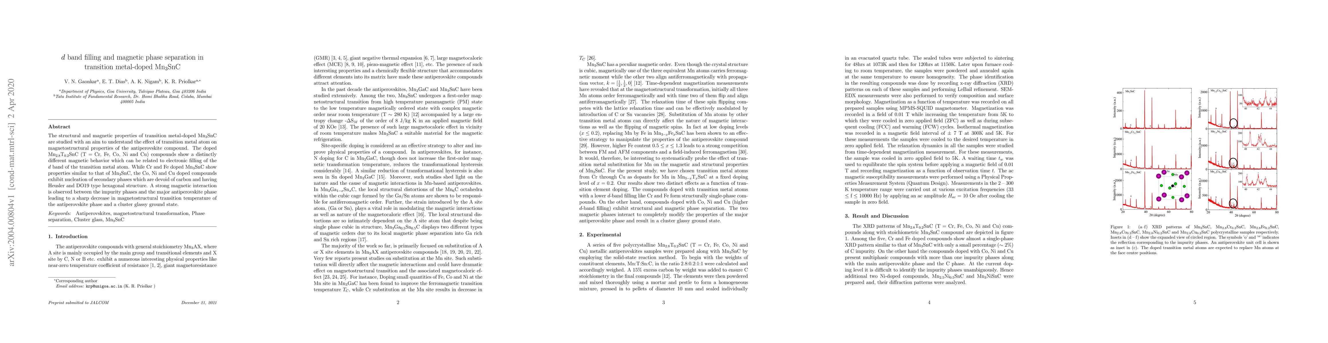 The structural and magnetic properties of transition metal-doped Mn$_3$SnC are studied with an aim to understand the effect of transition metal atom on magnetostructural properties of the antiperovskite compound. The doped Mn$_{2.8}$T$_{0.2}$SnC (T = Cr, Fe, Co, Ni and Cu) compounds show a distinctly different magnetic behavior which can be related to electronic filling of the $d$ band of the transition metal atom. While Cr and Fe doped Mn$_3$SnC show properties similar to that of Mn$_3$SnC, the Co, Ni and Cu doped compounds exhibit nucleation of secondary phases which are devoid of carbon and having Heusler and DO19 type hexagonal structure. A strong magnetic interaction is observed between the impurity phases and the major antiperovskite phase leading to a sharp decrease in magnetostructural transition temperature of the antiperovskite phase and a cluster glassy ground state.