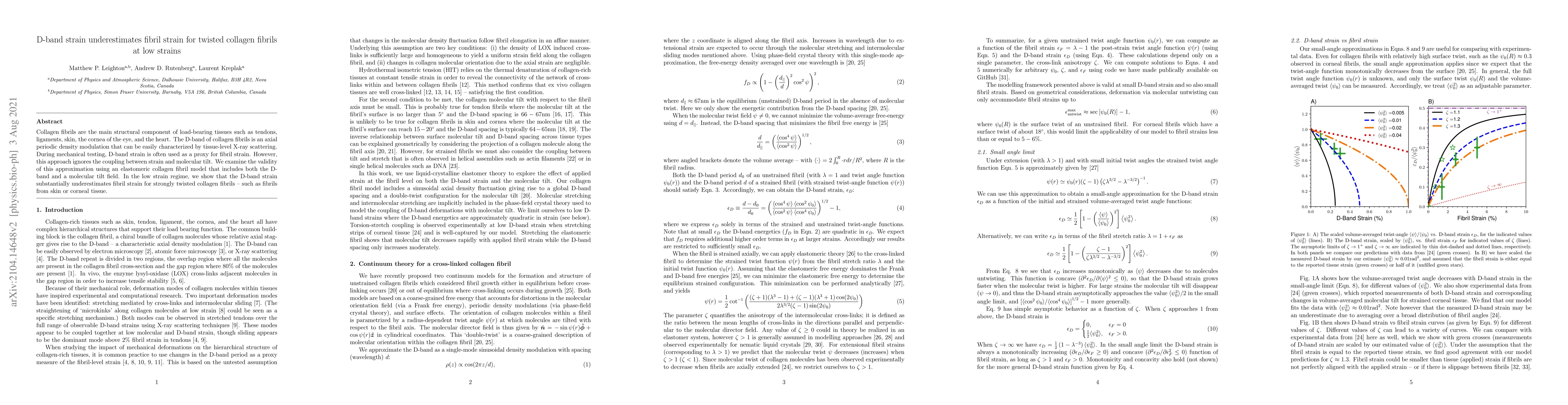 Collagen fibrils are the main structural component of load-bearing tissues such as tendons, ligaments, skin, the cornea of the eye, and the heart. The D-band of collagen fibrils is an axial periodic density modulation that can be easily characterized by tissue-level X-ray scattering. During mechanical testing, D-band strain is often used as a proxy for fibril strain. However, this approach ignores the coupling between strain and molecular tilt. We examine the validity of this approximation using an elastomeric collagen fibril model that includes both the D-band and a molecular tilt field. In the low strain regime, we show that the D-band strain substantially underestimates fibril strain for strongly twisted collagen fibrils -- such as fibrils from skin or corneal tissue.