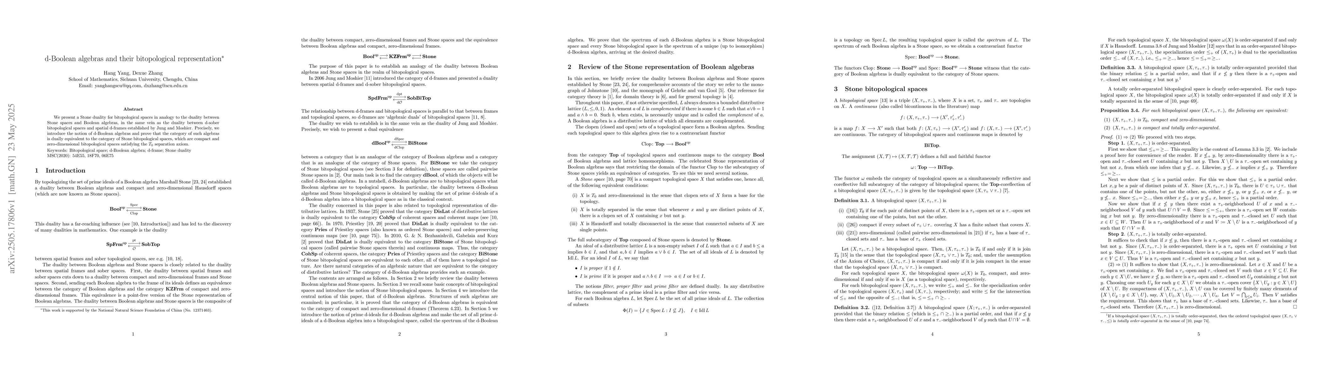 The paper introduces d-Boolean algebras and establishes a Stone duality between these algebras and Stone bitopological spaces, which are compact, zero-dimensional, and T0-separated.