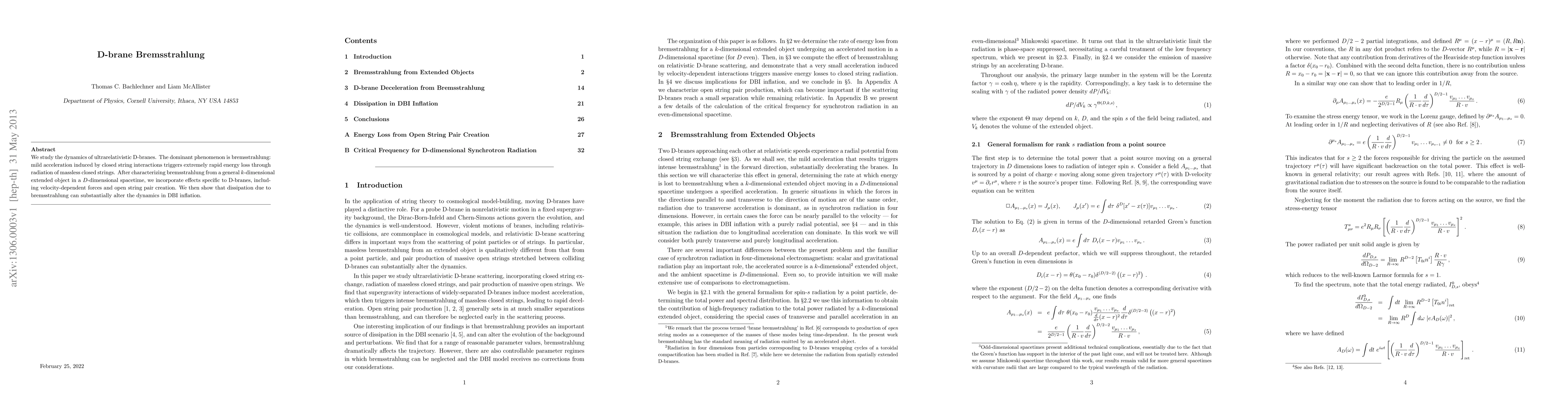 This paper investigates the dynamics of ultrarelativistic D-branes, focusing on bremsstrahlung—rapid energy loss through radiation of massless closed strings due to mild acceleration. It characterizes this phenomenon in general k-dimensional objects and highlights specific D-brane effects, ultimately showing that bremsstrahlung can significantly influence DBI inflation dynamics.