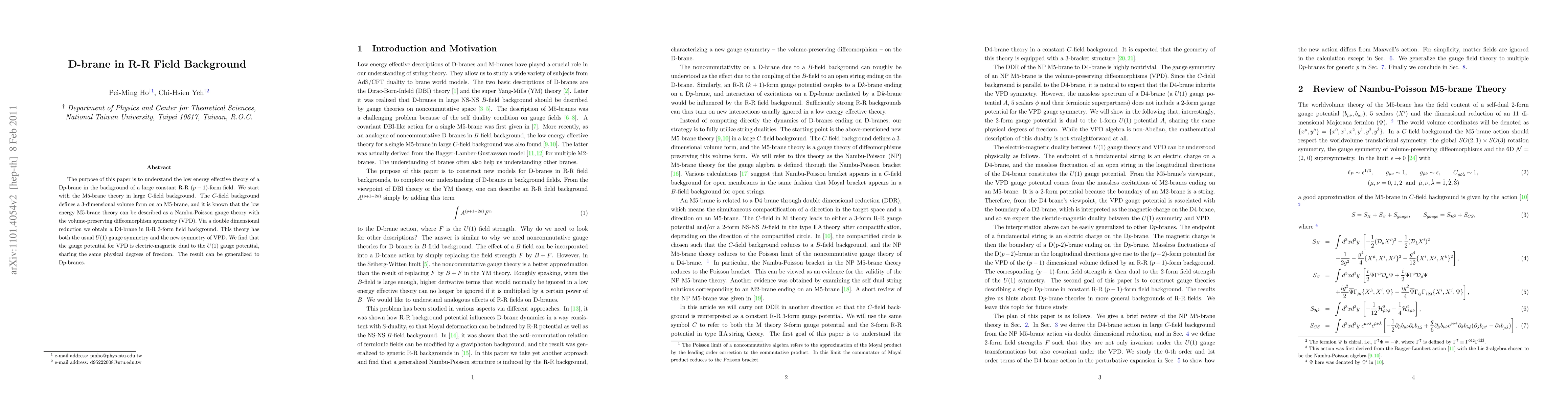 The purpose of this paper is to understand the low energy effective theory of a Dp-brane in the background of a large constant R-R (p-1)-form field. We start with the M5-brane theory in large C-field background. The C-field background defines a 3-dimensional volume form on an M5-brane, and it is known that the low energy M5-brane theory can be described as a Nambu-Poisson gauge theory with the volume-preserving diffeomorphism symmetry (VPD). Via a double dimensional reduction we obtain a D4-brane in R-R 3-form field background. This theory has both the usual U(1) gauge symmetry and the new symmetry of VPD. We find that the gauge potential for VPD is electric-magnetic dual to the U(1) gauge potential, sharing the same physical degrees of freedom. The result can be generalized to Dp-branes.