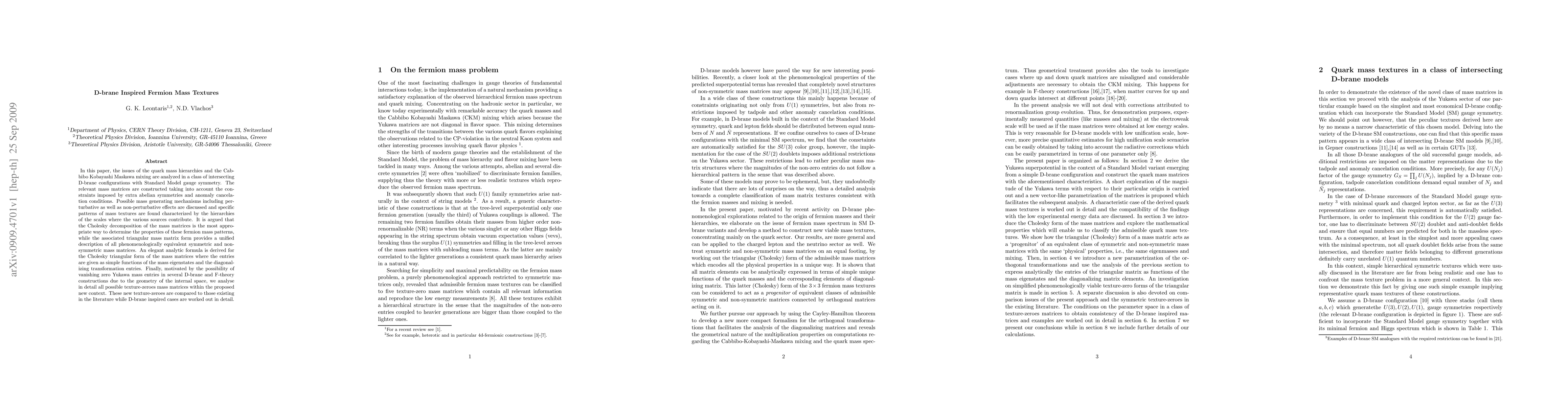 In this paper, the issues of the quark mass hierarchies and the Cabbibo Kobayashi Maskawa mixing are analyzed in a class of intersecting D-brane configurations with Standard Model gauge symmetry. The relevant mass matrices are constructed taking into account the constraints imposed by extra abelian symmetries and anomaly cancelation conditions. Possible mass generating mechanisms including perturbative as well as non-perturbative effects are discussed and specific patterns of mass textures are found characterized by the hierarchies of the scales where the various sources contribute. It is argued that the Cholesky decomposition of the mass matrices is the most appropriate way to determine the properties of these fermion mass patterns, while the associated triangular mass matrix form provides a unified description of all phenomenologically equivalent symmetric and non-symmetric mass matrices. An elegant analytic formula is derived for the Cholesky triangular form of the mass matrices where the entries are given as simple functions of the mass eigenstates and the diagonalizing transformation entries. Finally, motivated by the possibility of vanishing zero Yukawa mass entries in several D-brane and F-theory constructions due to the geometry of the internal space, we analyse in detail all possible texture-zeroes mass matrices within the proposed new context. These new texture-zeroes are compared to those existing in the literature while D-brane inspired cases are worked out in detail.