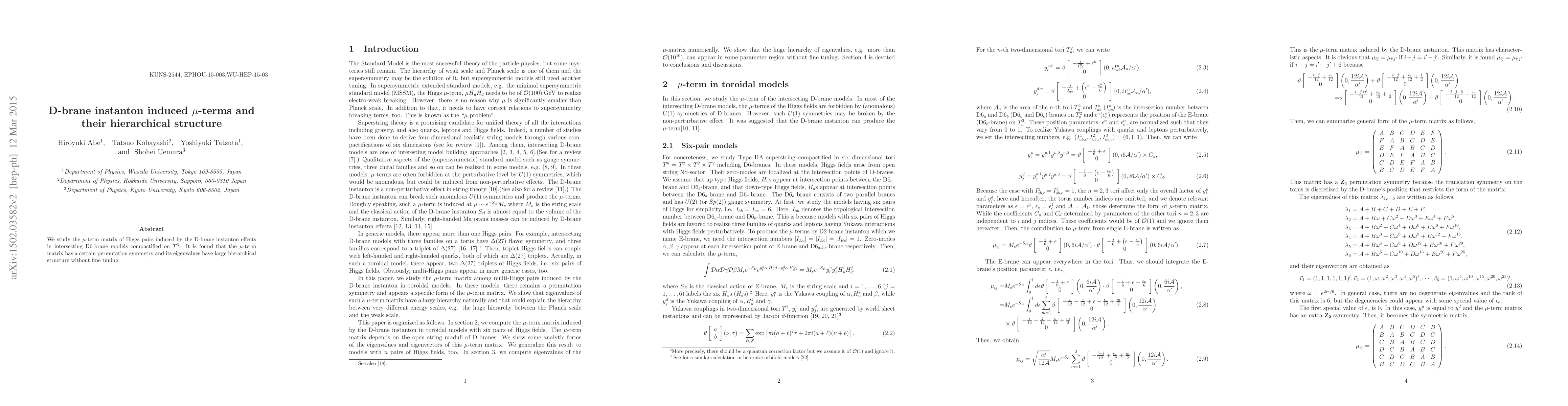 Summary: The research investigates D-brane instanton effects in intersecting D6-brane models, revealing a mu-term matrix with permutation symmetry and hierarchical eigenvalue structure without requiring fine-tuning. This suggests a natural explanation for the observed hierarchy in the Higgs sector.