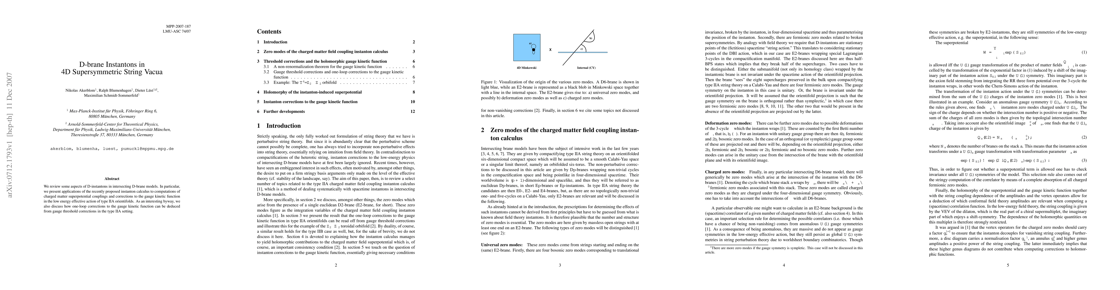 Summary: This paper reviews D-instantons in intersecting D-brane models, applying a new instanton calculus to compute charged matter couplings and gauge kinetic corrections in type IIA orientifolds, and explores the relationship between gauge threshold corrections and one-loop gauge kinetic function corrections.
