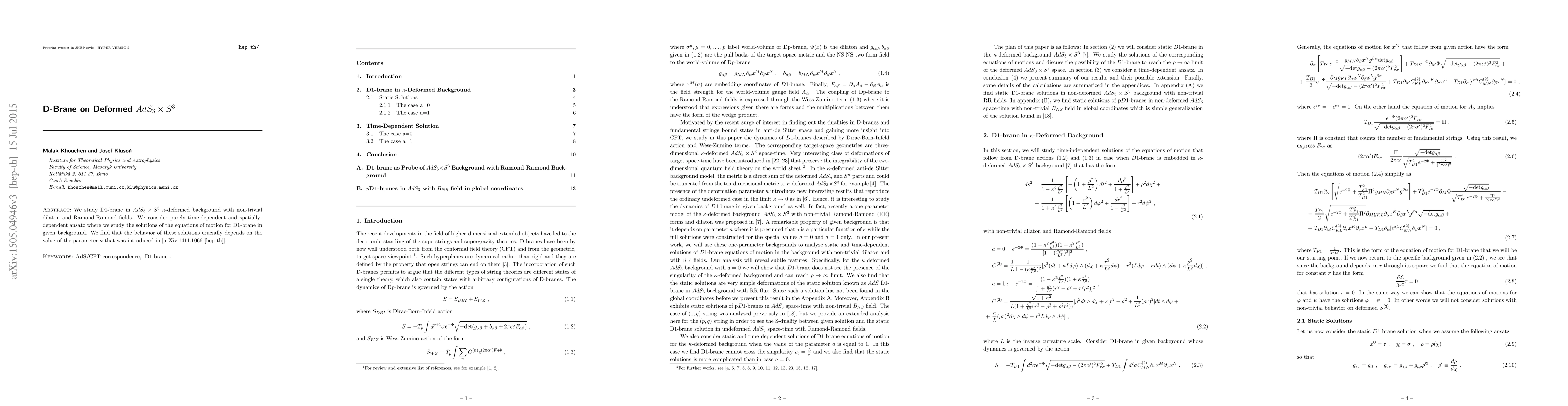 Summary: This research investigates D1-brane dynamics in a kappa-deformed AdS_3 × S^3 background with non-trivial dilaton and Ramond-Ramond fields, revealing that solutions' behavior hinges on a parameter introduced in a prior study. The study employs time-dependent and spatially-dependent ansatz to derive these solutions.