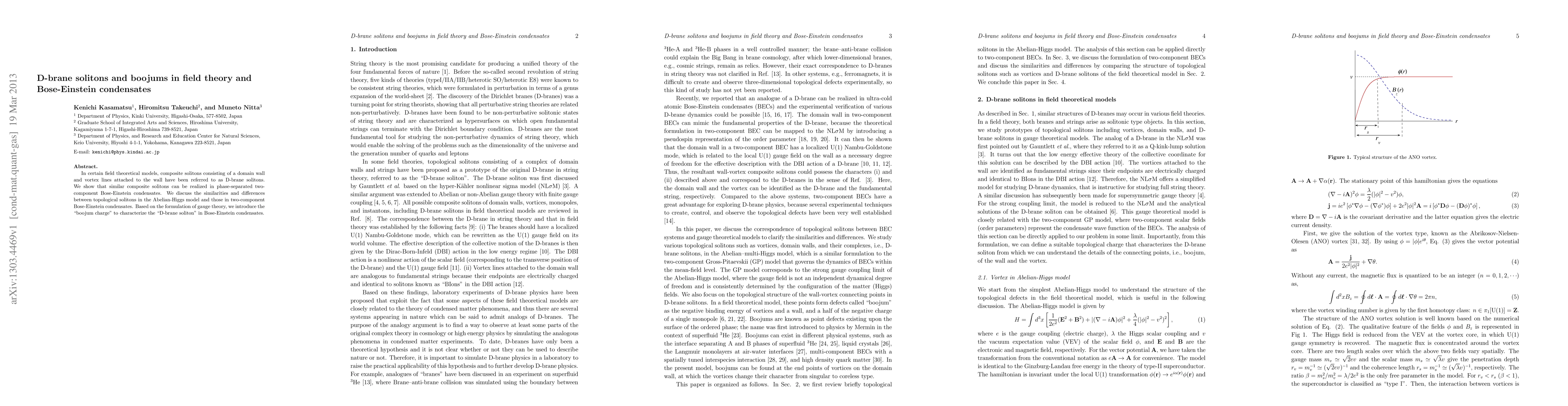 This paper explores the analogy between D-brane solitons in field theory and composite solitons in phase-separated two-component Bose-Einstein condensates, introducing the concept of "boojum charge" to characterize these solitons in the latter context. It highlights both the similarities and differences between topological solitons in the Abelian-Higgs model and those in Bose-Einstein condensates.