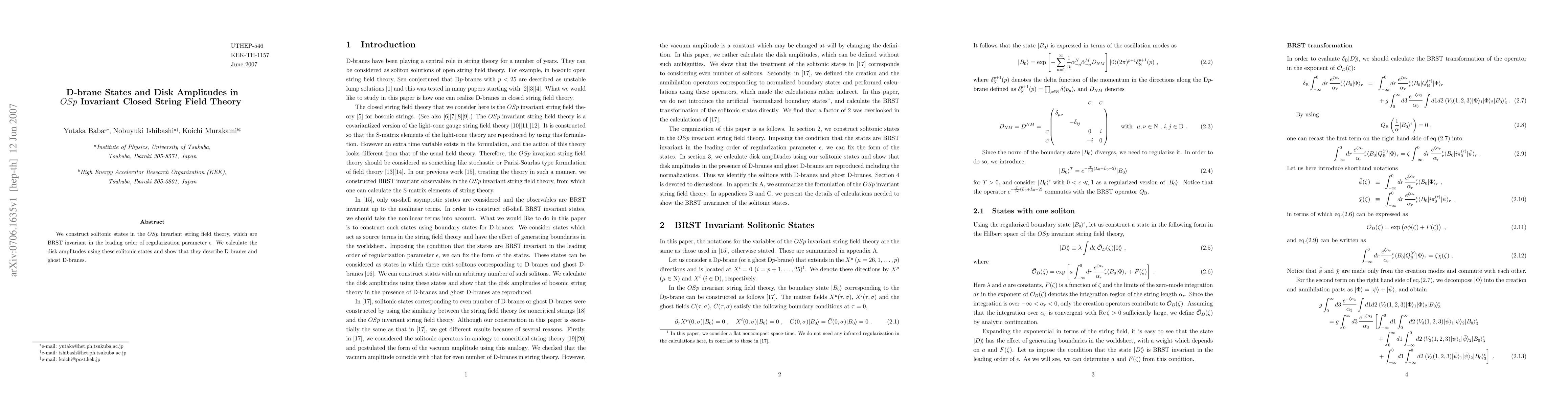 We construct solitonic states in the OSp invariant string field theory, which are BRST invariant in the leading order of regularization parameter $\epsilon$. We calculate the disk amplitudes using these solitonic states and show that they describe D-branes and ghost D-branes.