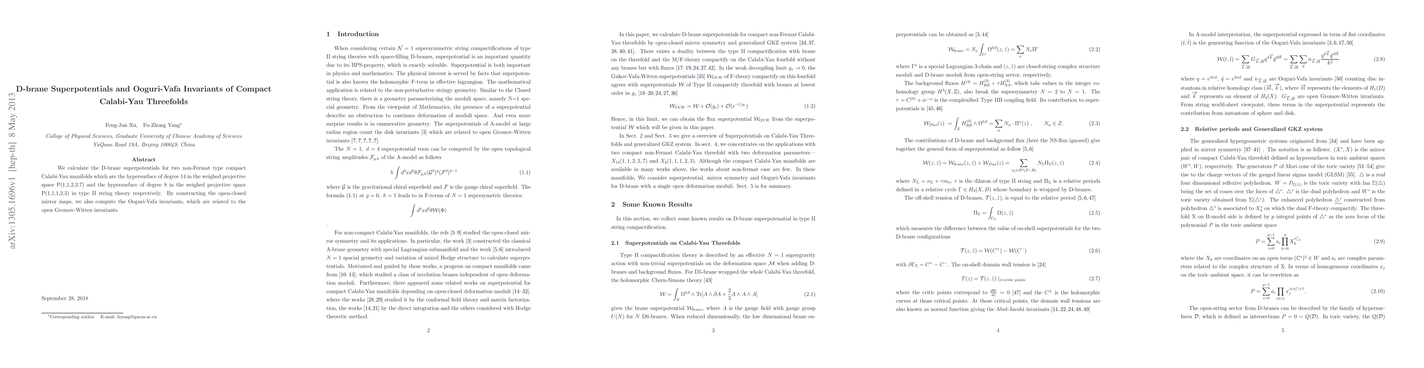 This paper calculates D-brane superpotentials for two non-Fermat compact Calabi-Yau manifolds, deriving open-closed mirror maps and computing Ooguri-Vafa invariants linked to open Gromov-Witten invariants in type II string theory.