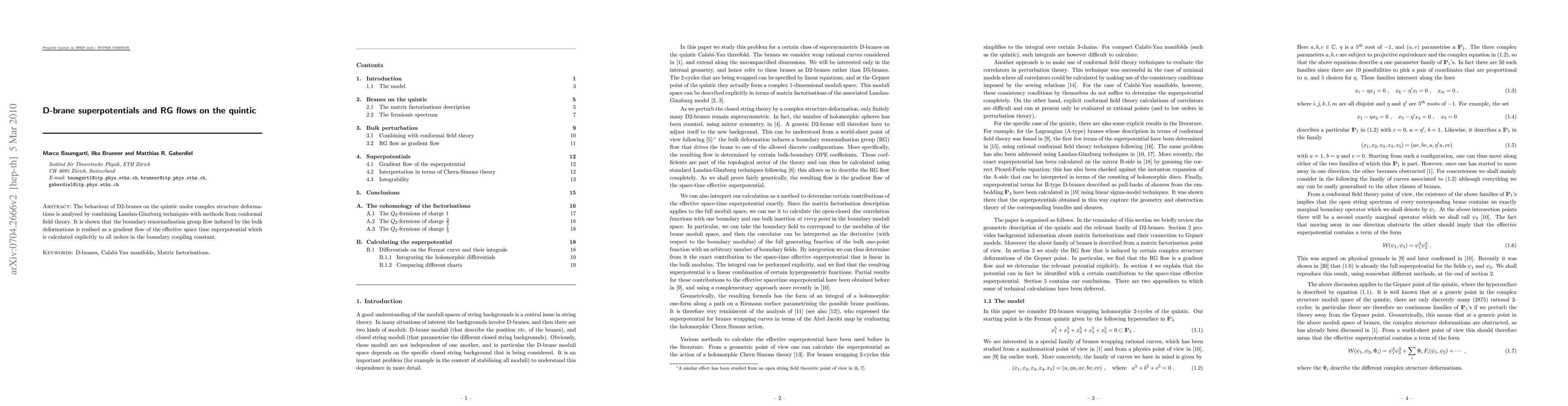 The behaviour of D2-branes on the quintic under complex structure deformations is analysed by combining Landau-Ginzburg techniques with methods from conformal field theory. It is shown that the boundary renormalisation group flow induced by the bulk deformations is realised as a gradient flow of the effective space time superpotential which is calculated explicitly to all orders in the boundary coupling constant.