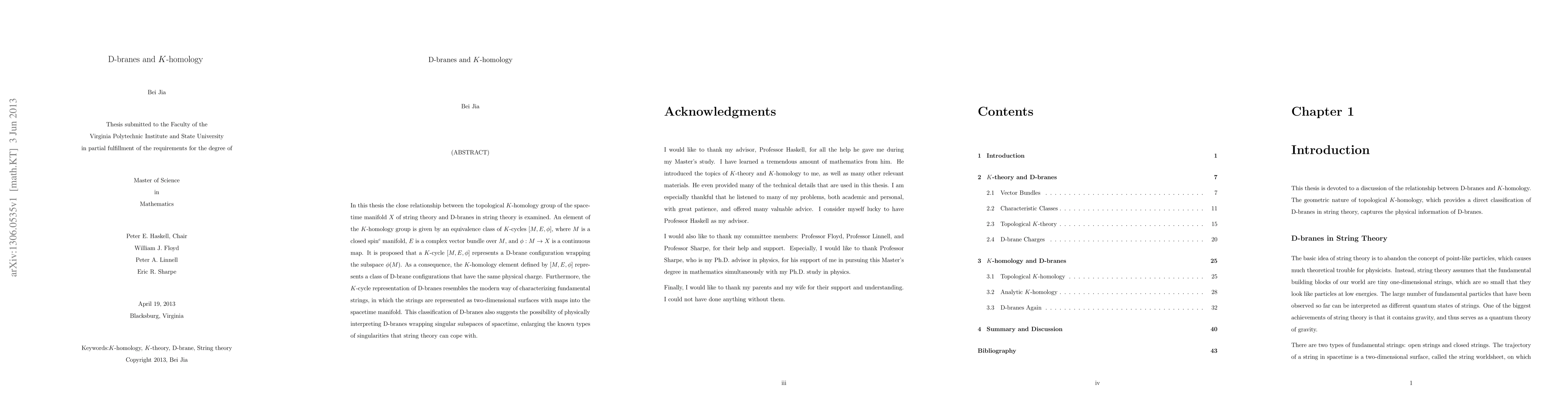 In this thesis the close relationship between the topological $K$-homology group of the spacetime manifold $X$ of string theory and D-branes in string theory is examined. An element of the $K$-homology group is given by an equivalence class of $K$-cycles $[M,E,\phi]$, where $M$ is a closed spin$^c$ manifold, $E$ is a complex vector bundle over $M$, and $\phi: M\rightarrow X$ is a continuous map. It is proposed that a $K$-cycle $[M,E,\phi]$ represents a D-brane configuration wrapping the subspace $\phi(M)$. As a consequence, the $K$-homology element defined by $[M,E,\phi]$ represents a class of D-brane configurations that have the same physical charge. Furthermore, the $K$-cycle representation of D-branes resembles the modern way of characterizing fundamental strings, in which the strings are represented as two-dimensional surfaces with maps into the spacetime manifold. This classification of D-branes also suggests the possibility of physically interpreting D-branes wrapping singular subspaces of spacetime, enlarging the known types of singularities that string theory can cope with.
