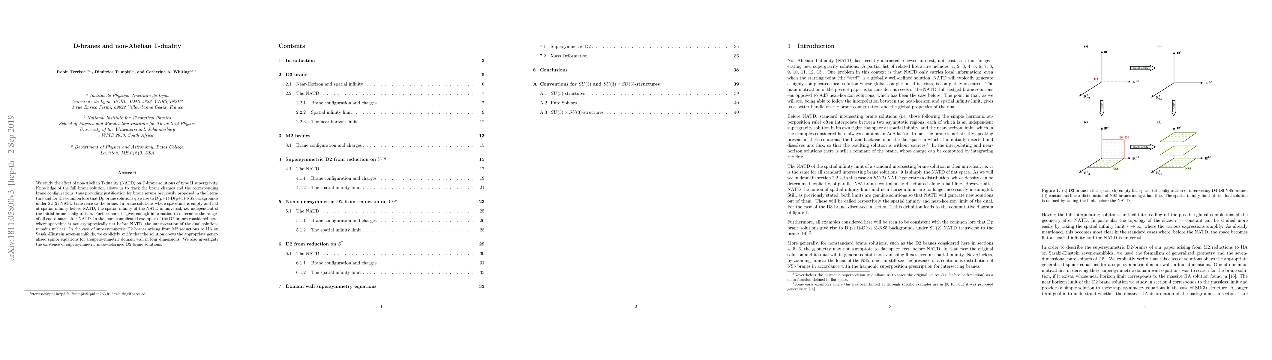 This paper explores the impact of non-Abelian T-duality on D-brane solutions in type II supergravity, confirming the emergence of D(p+1)-D(p+3)-NS5 backgrounds under SU(2) NATD. It also verifies the universal nature of spatial infinity post-NATD and investigates supersymmetric D2 brane solutions, confirming their consistency with generalized spinor equations.