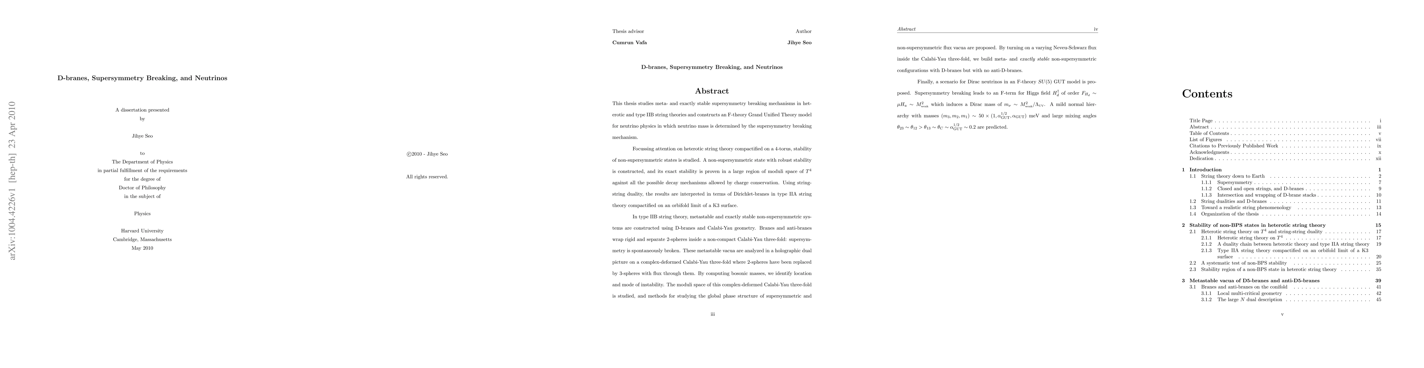 This thesis studies meta- and exactly stable supersymmetry breaking mechanisms in heterotic and type IIB string theories and constructs an F-theory Grand Unified Theory model for neutrino physics in which neutrino mass is determined by the supersymmetry breaking mechanism. Focussing attention on heterotic string theory compactified on a 4-torus, stability of non-supersymmetric states is studied. A non-supersymmetric state with robust stability is constructed, and its exact stability is proven in a large region of moduli space of T^4 against all the possible decay mechanisms allowed by charge conservation. Using string-string duality, the results are interpreted in terms of Dirichlet-branes in type IIA string theory compactified on an orbifold limit of a K3 surface. In type IIB string theory, metastable and exactly stable non-supersymmetric systems are constructed using D-branes and Calabi-Yau geometry. Branes and anti-branes wrap rigid and separate 2-spheres inside a non-compact Calabi-Yau three-fold: supersymmetry is spontaneously broken. These metastable vacua are analyzed in a holographic dual picture on a complex-deformed CY3 where 2-spheres have been replaced by 3-spheres with flux through them. By computing bosonic masses, we identify location and mode of instability. The moduli space of this complex-deformed CY3 is studied, and methods for studying the global phase structure of supersymmetric and non-supersymmetric flux vacua are proposed. By turning on a varying Neveu-Schwarz flux inside the CY3, we build meta- and exactly stable non-supersymmetric configurations with D-branes but with no anti-D-branes. Finally, a scenario for Dirac neutrinos in an F-theory SU(5) GUT model is proposed. Supersymmetry breaking leads to an F-term for Higgs field which induces a Dirac mass. A mild normal hierarchy and large mixing angles are predicted.