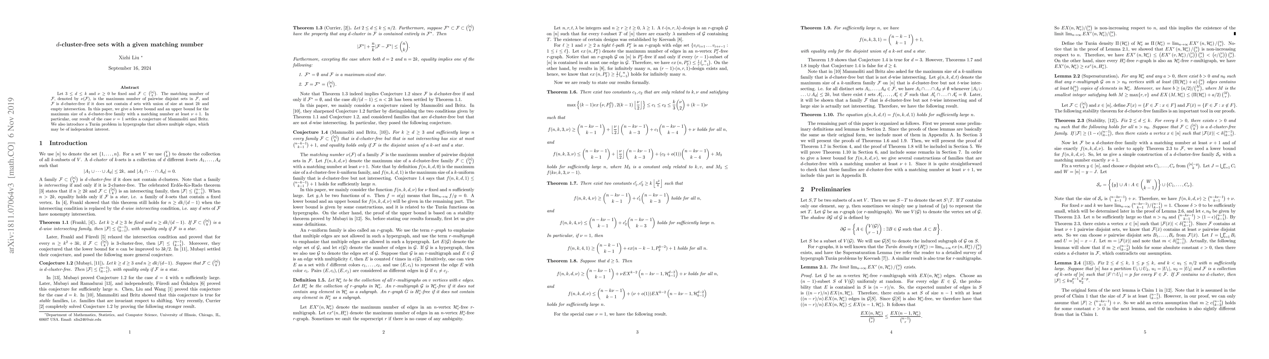 This paper presents bounds for the maximum size of a d-cluster-free set family, where d ≥ 3 and k, ν ≥ 0, with a matching number of at least ν+1. It specifically resolves a conjecture by Mammoliti and Britz for the case when ν=1, introducing a Turán problem in hypergraphs with multiple edges as a byproduct.