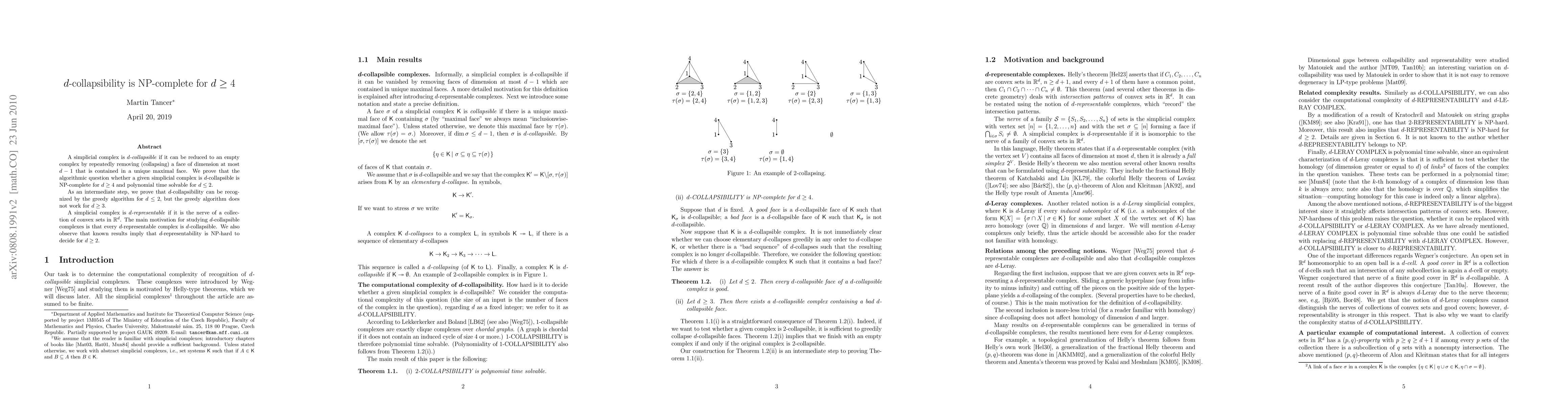 This paper proves that determining d-collapsibility for simplicial complexes is NP-complete for d ≥ 4, while it is polynomial time solvable for d ≤ 2. The greedy algorithm works for d ≤ 2 but fails for d ≥ 3, highlighting the complexity increase with higher dimensions.