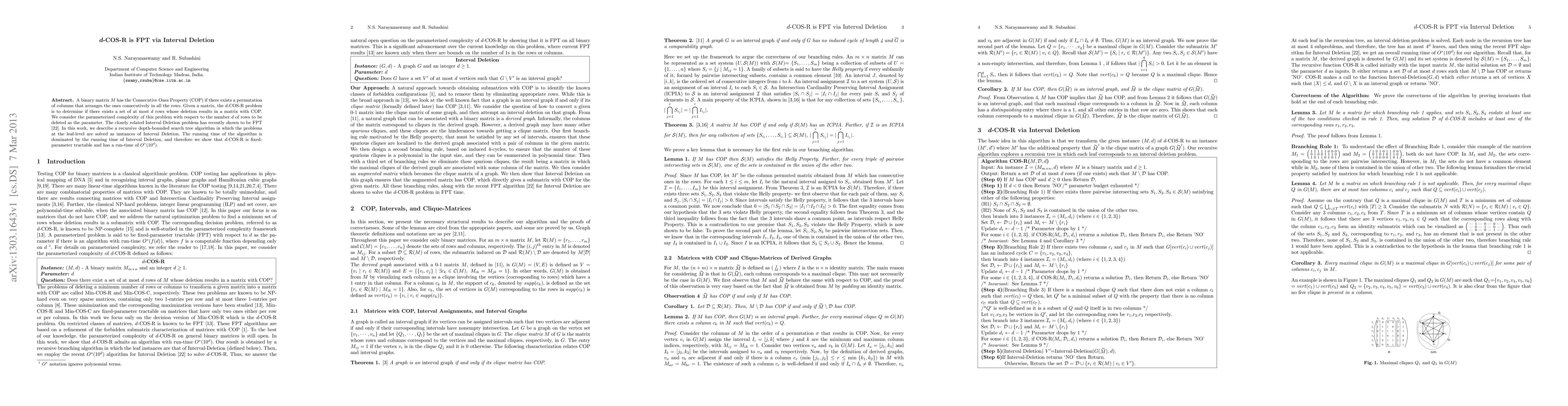 The paper presents a recursive depth-bounded search tree algorithm to solve the $d$-COS-R problem, which determines if a binary matrix can be rearranged to have consecutive ones in all rows by deleting at most $d$ rows. The algorithm leverages the fixed-parameter tractability of the related Interval Deletion problem, resulting in a runtime of $O^*(10^d)$.