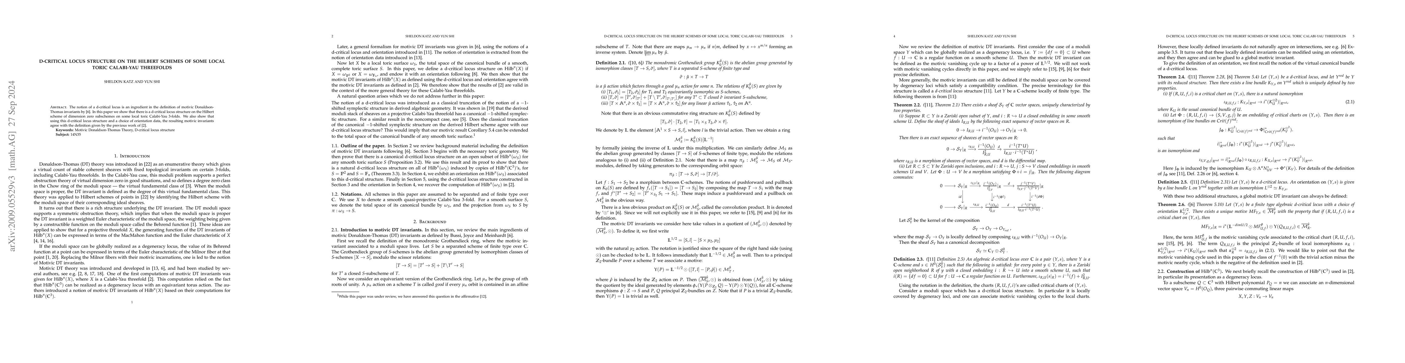 Researchers found a d-critical locus structure on the Hilbert scheme of subschemes in local toric Calabi-Yau threefolds, confirming agreement with previous work on motivic Donaldson-Thomas invariants.